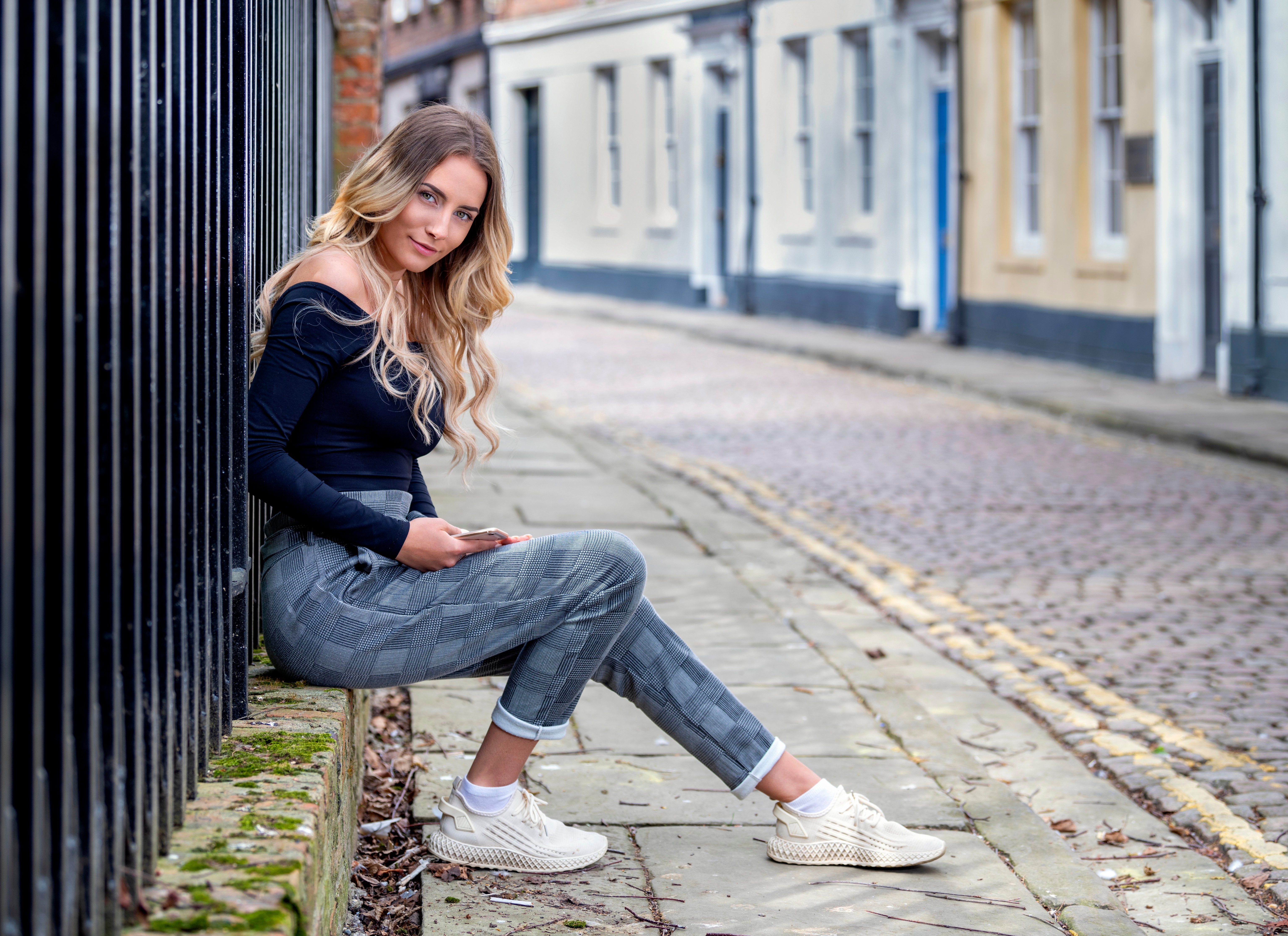 Description: A woman sitting on a wall in a street with a brick sidewalk and buildings in the background.