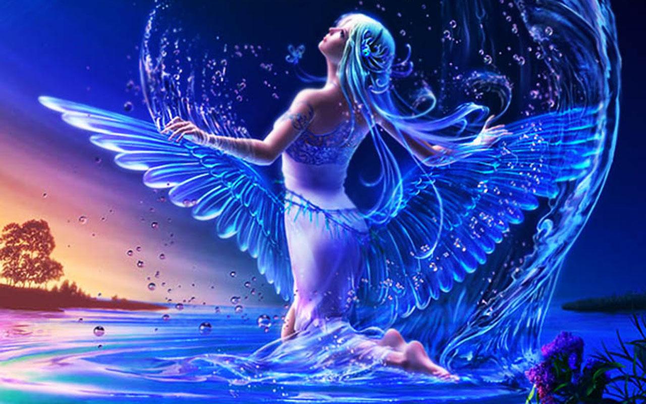 Description: A woman in a body of water with wings flying above her head and body of water below her head.