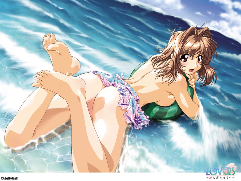 Description: A woman laying on top of a wave in a bikini on a surfboard in the ocean with her legs spread out.