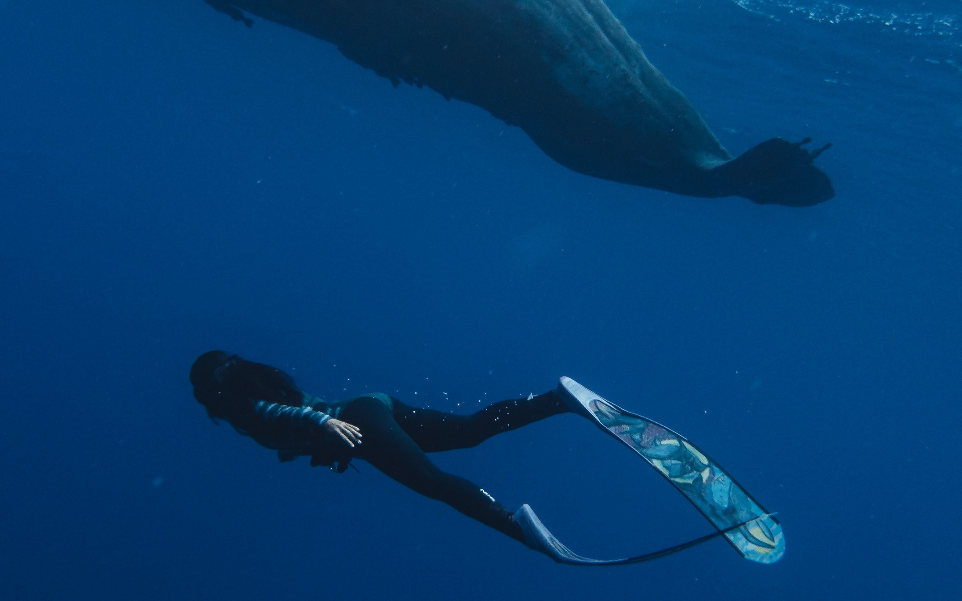Description: A woman in a wet suit is swimming next to a large animal in the water with a surfboard.