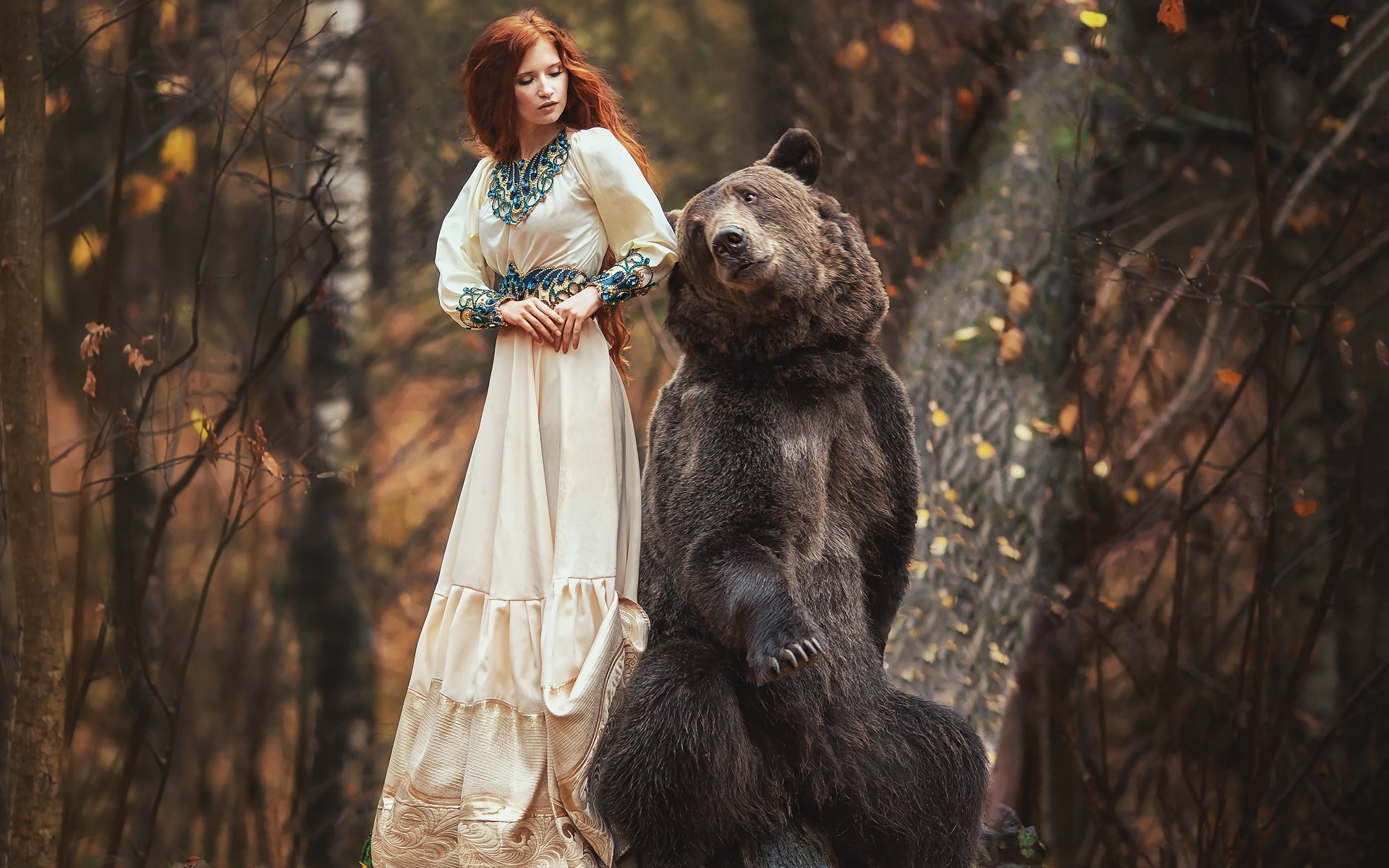 Description: A woman in a white dress standing next to a brown bear in a forest with trees and leaves behind her.