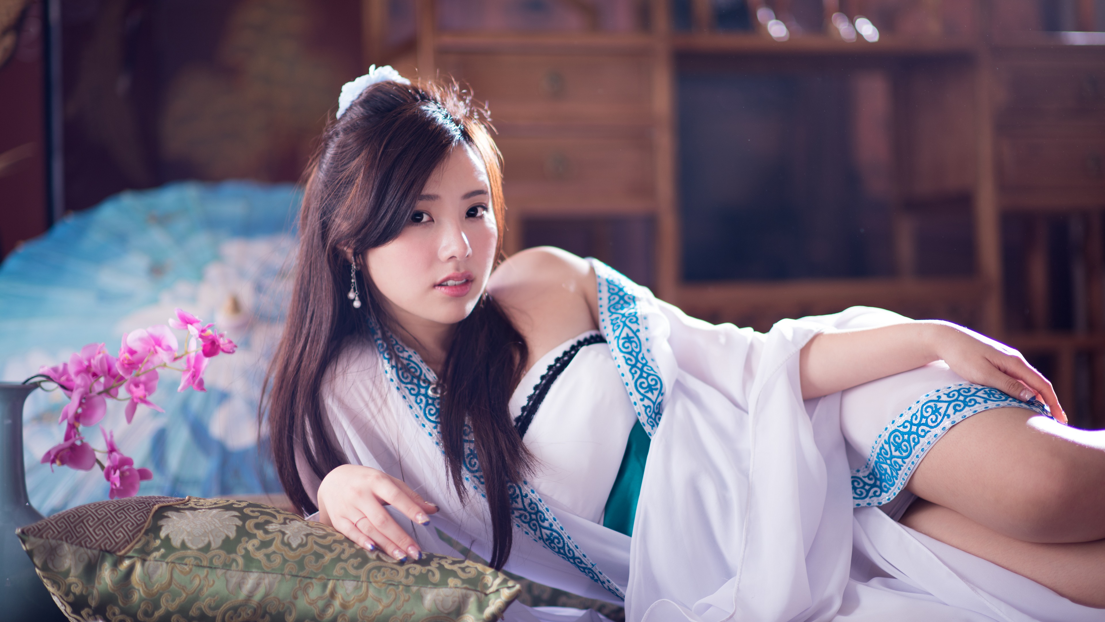Description: A woman in a white dress laying on a bed with a flower in her hair and a blue and white dress.