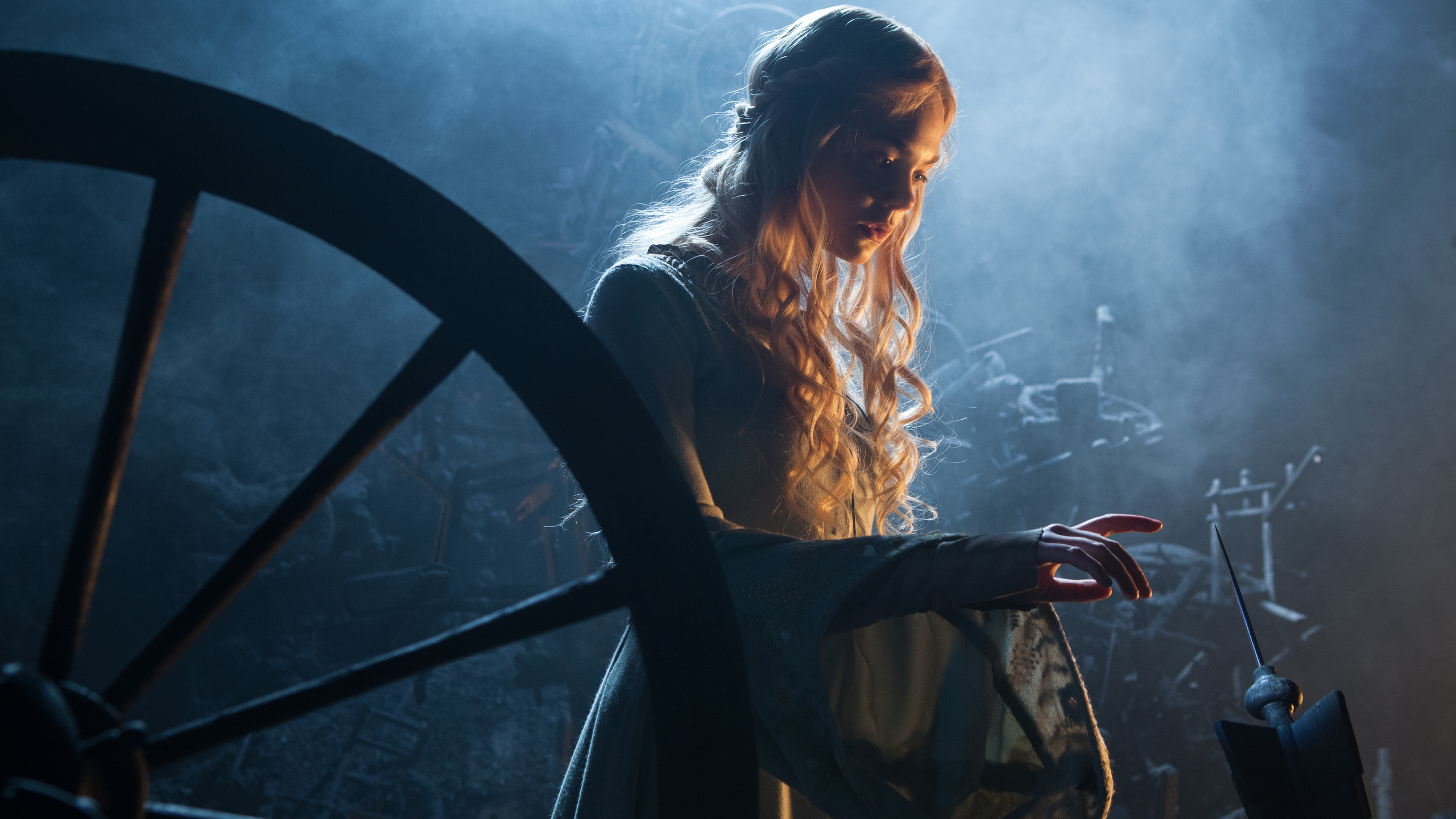 Description: A woman in a white dress holding a black umbrella in front of a wheel and smokestacks behind her.