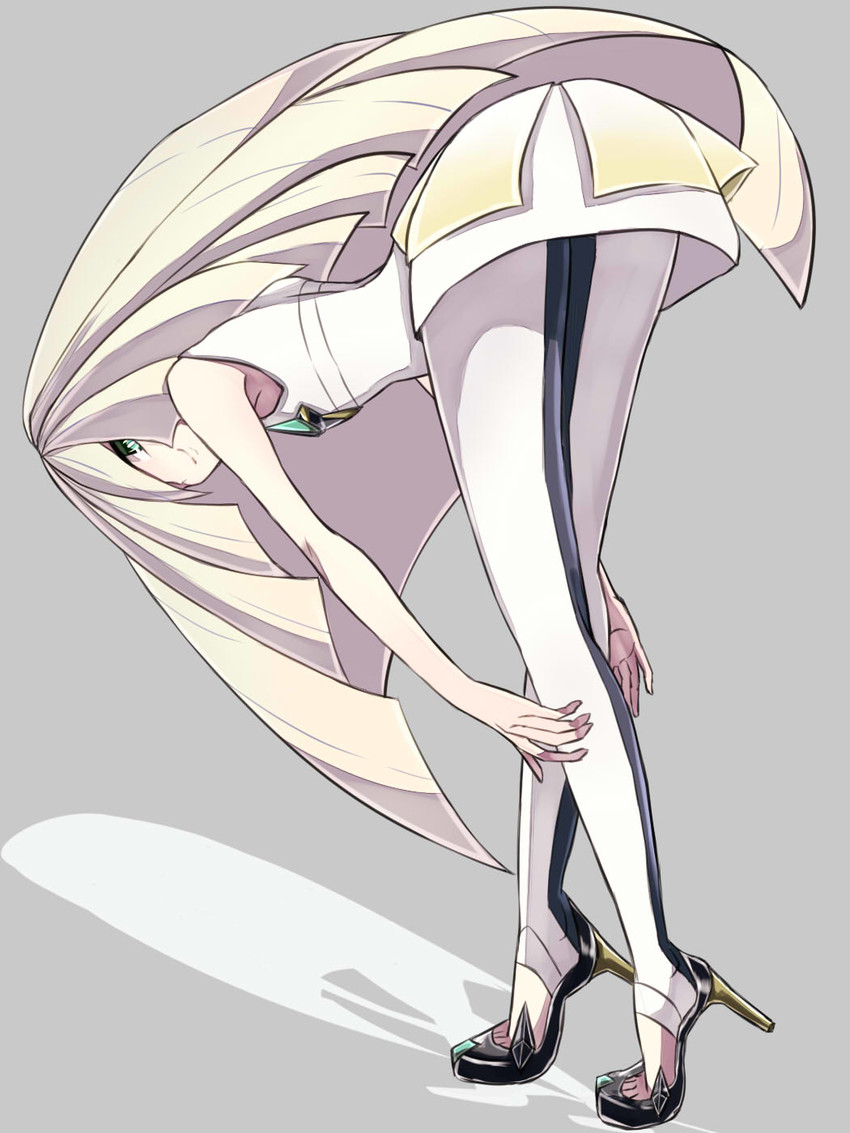 Description: A woman in a white dress and black shoes bending over her head with her hands on her hips and her legs bent over her head.