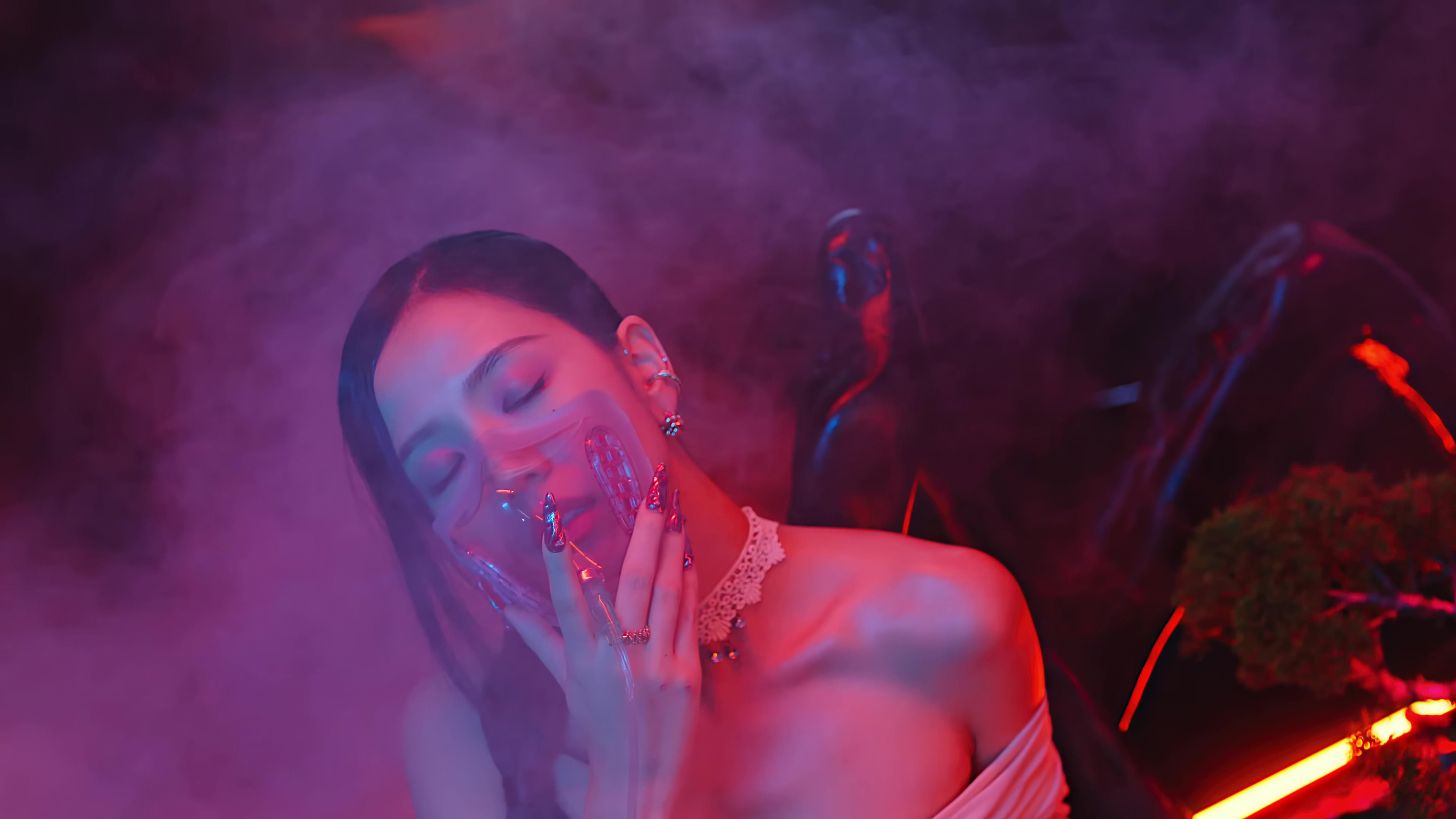 Description: A woman in a white dress blowing bubbles of liquid on her face in a dark room with a bike behind her.