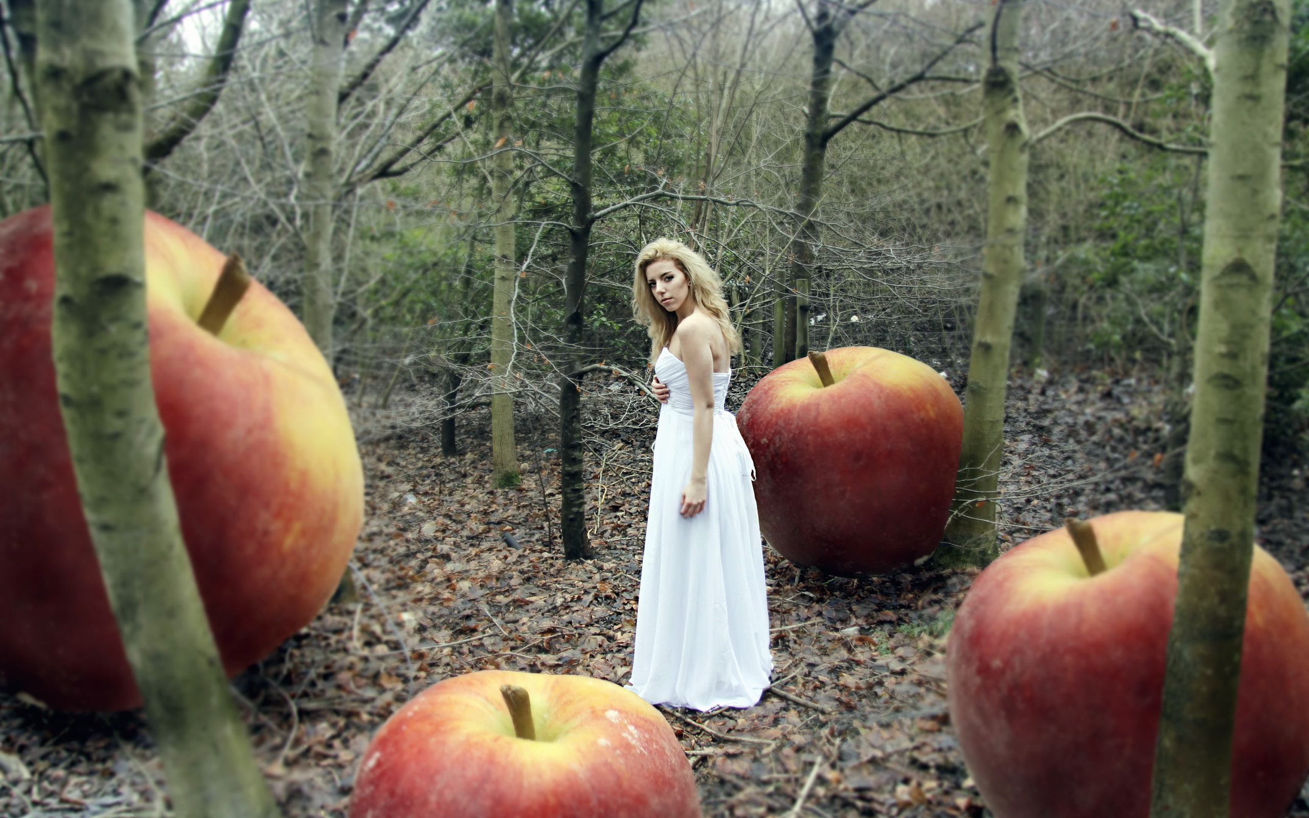 Description: A woman in a white dress standing in a forest with apples on the ground and trees in the background.