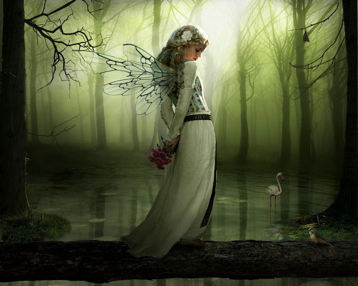 Description: A woman in a white dress standing in a forest with a bird on her shoulder and a white dress on her shoulder.