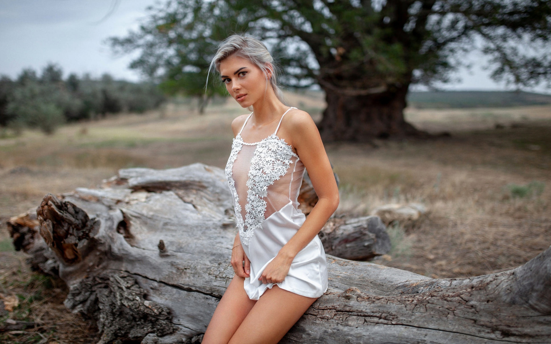 Description: A woman in a white dress posing for a picture in front of a tree trunk and a field with grass.