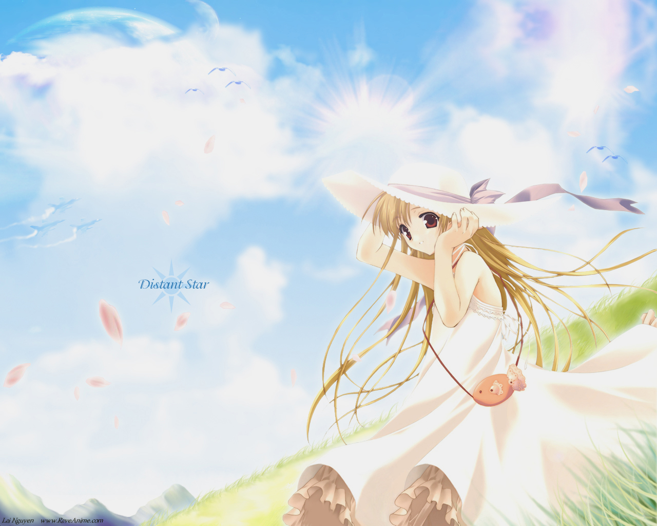 Description: A woman in a white dress and hat is holding a cell phone to her ear and looking at the sky.