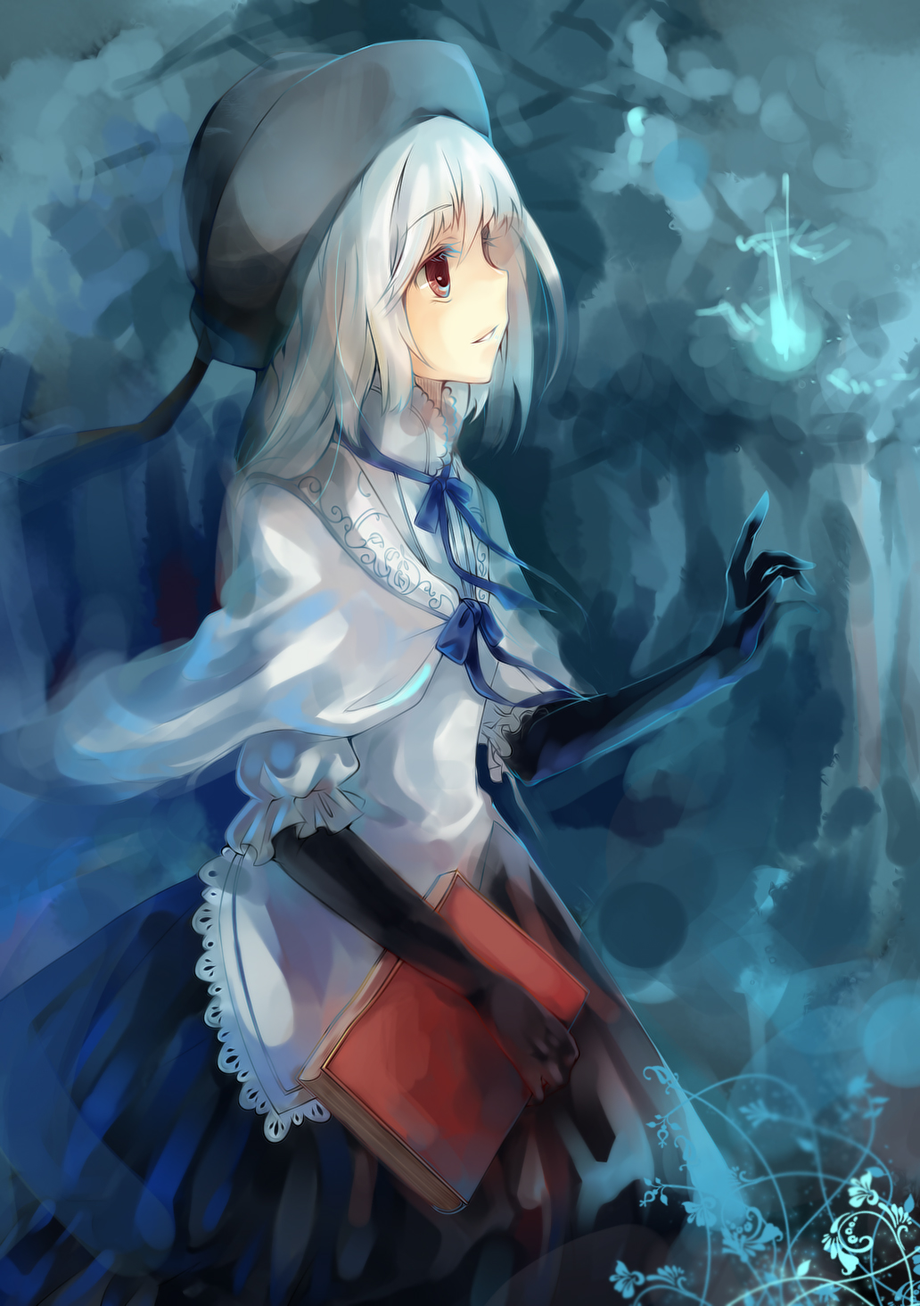Description: A woman in a white dress and a hat holding a red book and a blue umbrella in her hand.