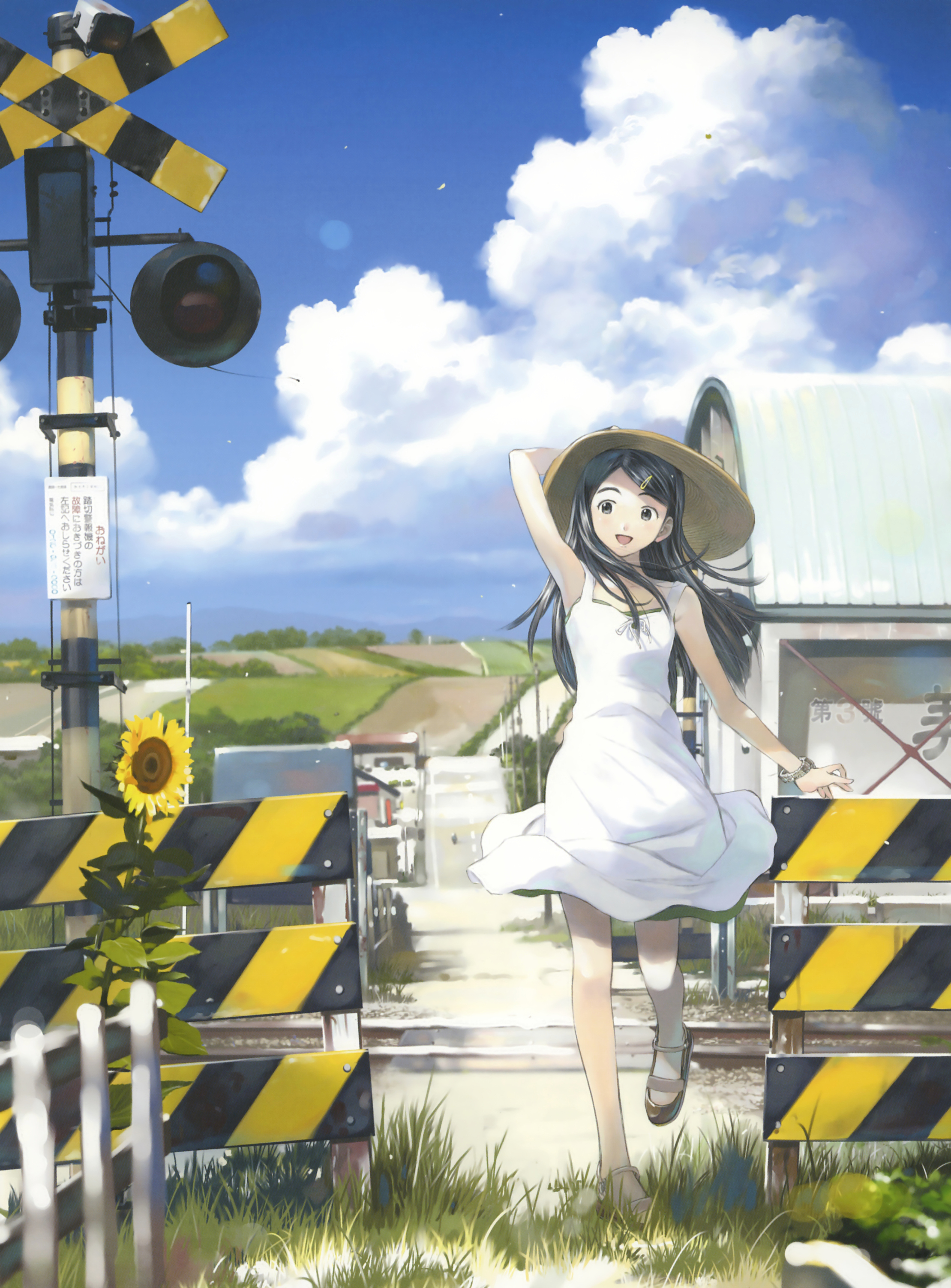 Description: A woman in a white dress and hat walking down a street next to a traffic light and a yellow and black striped fence.