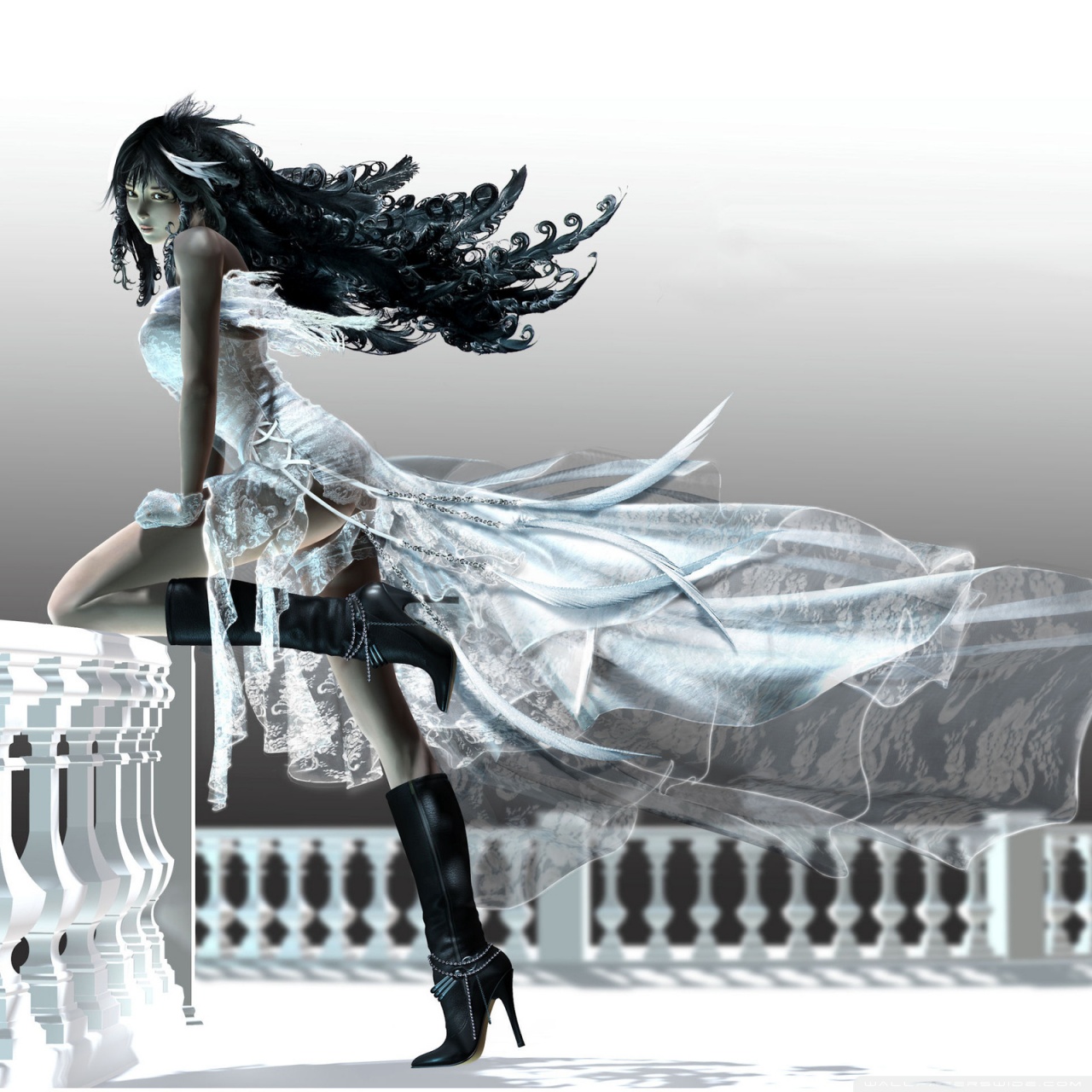 Description: A woman in a white dress and high heels is posing on a balcony with a white fence and a white fence.