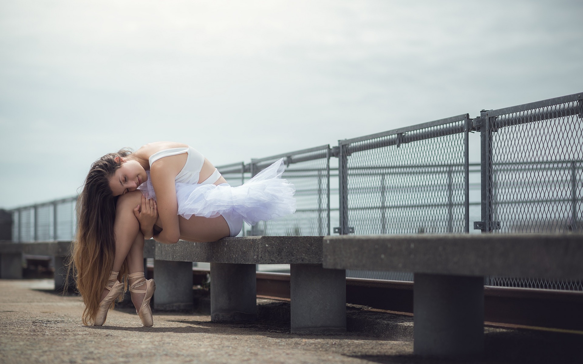 Description: A woman in a white dress leaning on a bench with her legs crossed and her head down on her knees.