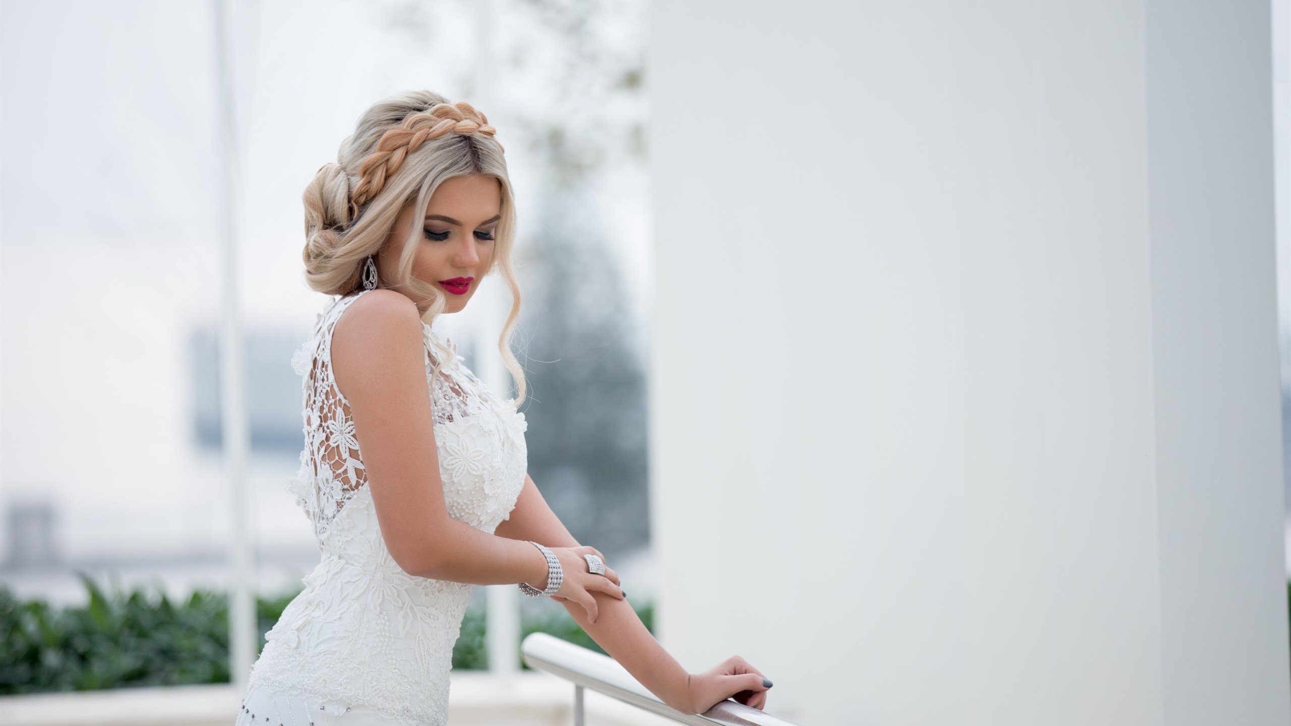 Description: A woman in a white dress leaning on a railing with her hand on her hip and looking down at her.