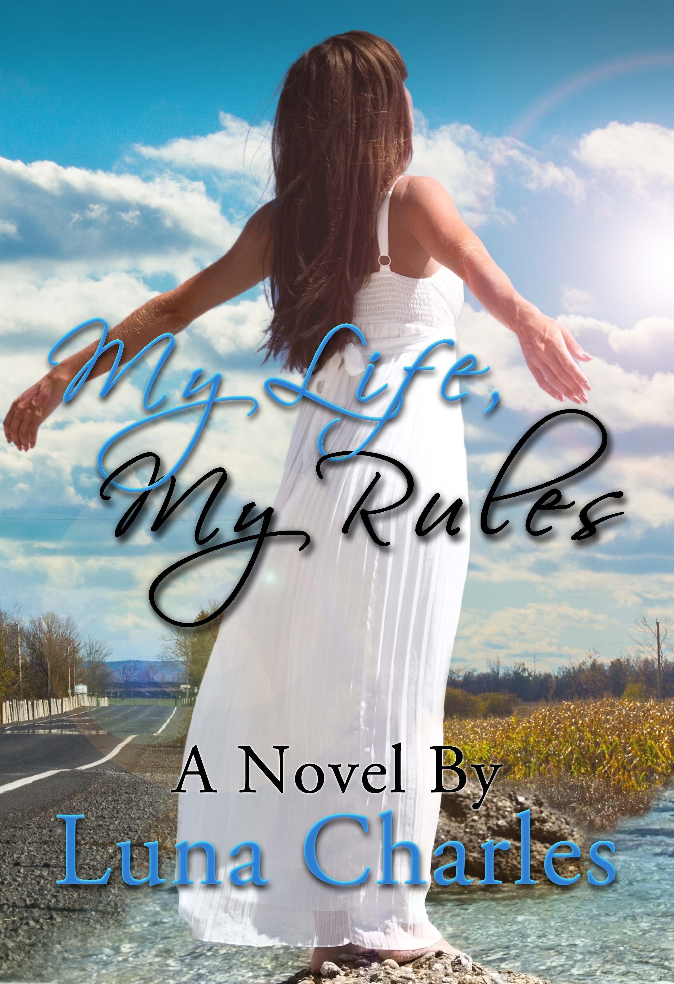 Description: A woman in a white dress standing on a rock with her arms outstretched and her arms outstretched.
