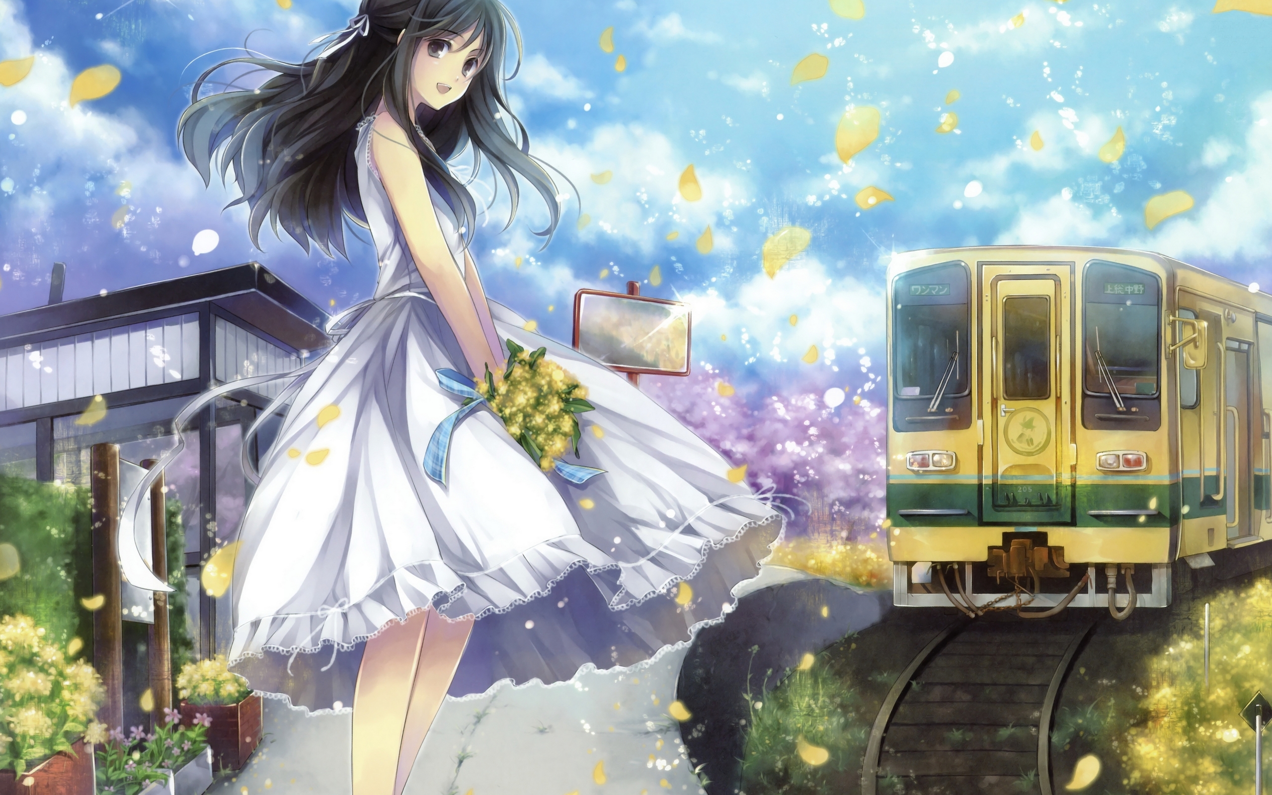 Description: A woman in a white dress is standing on a train track with a train in the background and a train on the tracks.