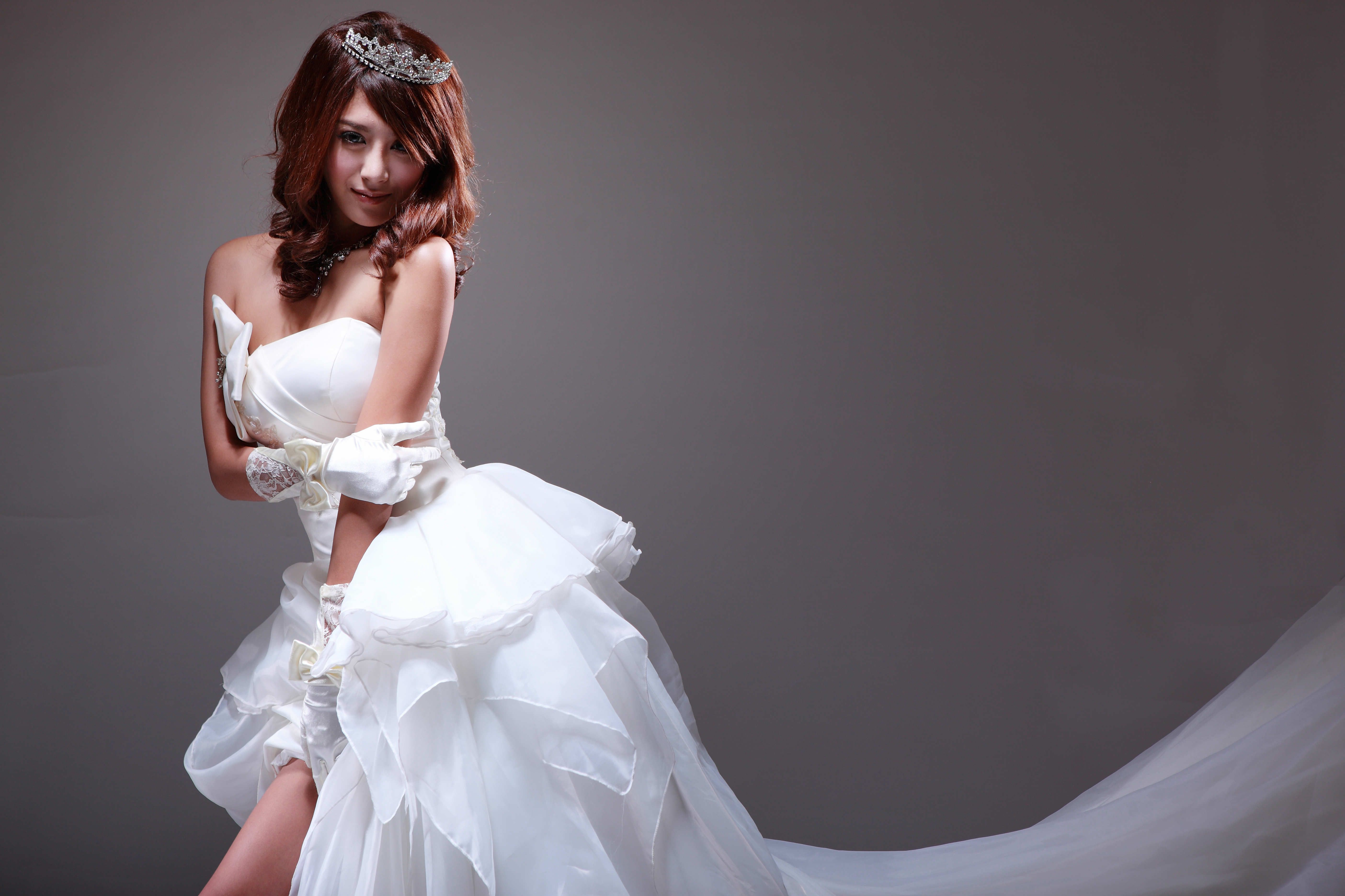 Description: A woman in a white dress posing for a picture with a veil on her head and a flower in her hair.