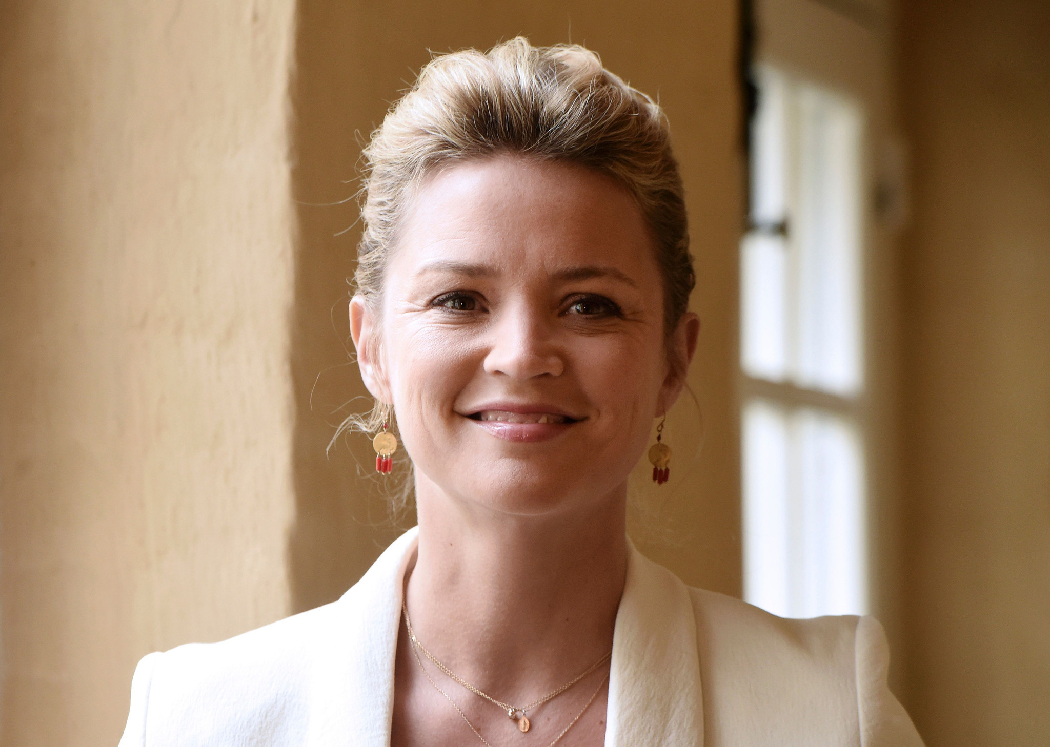 Description: A woman in a white jacket smiling for the camera with a window behind her and a wall in the background.