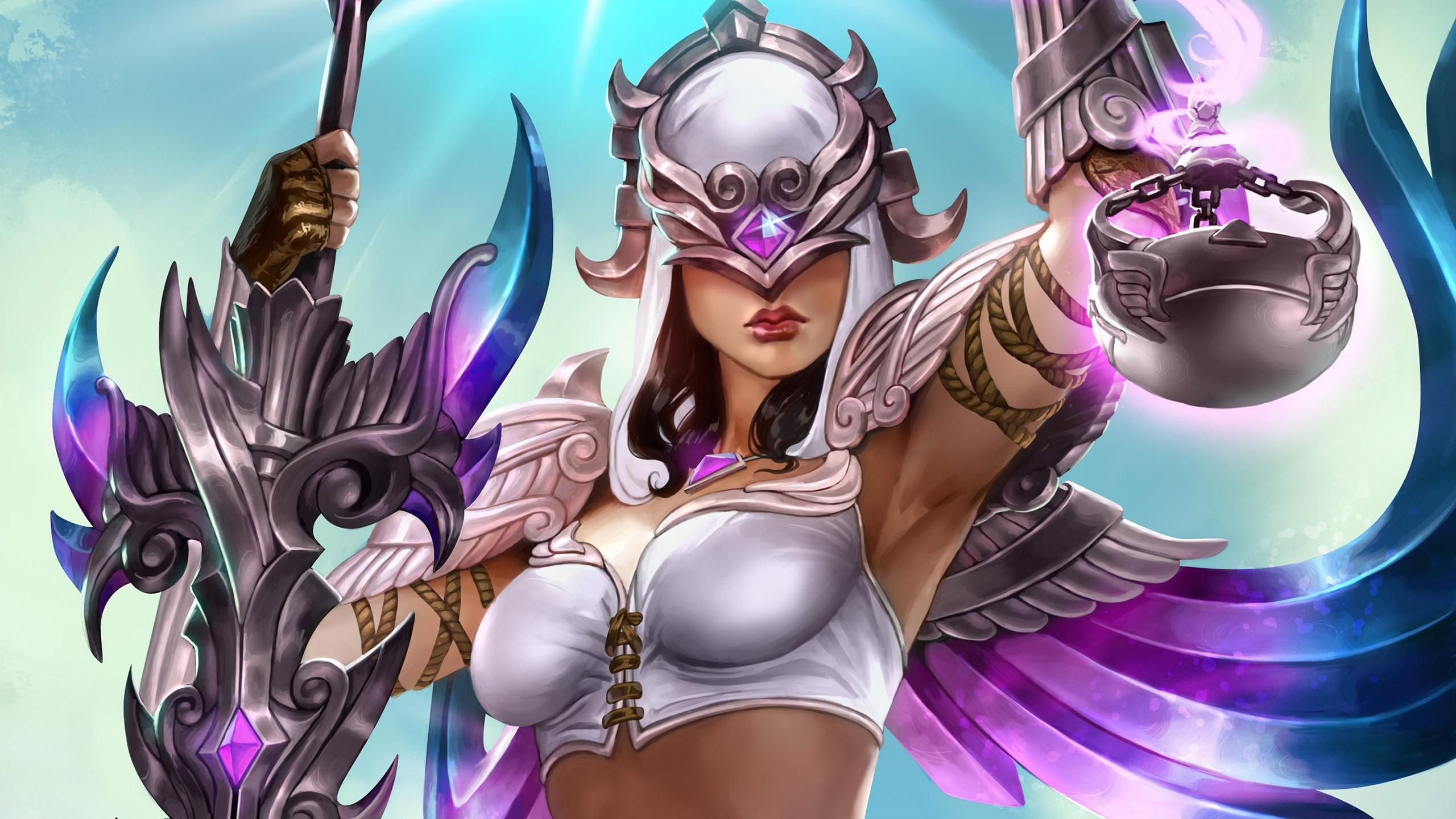 Description: A woman in a white outfit holding a sword and a bowl of food in her hands with a purple background.