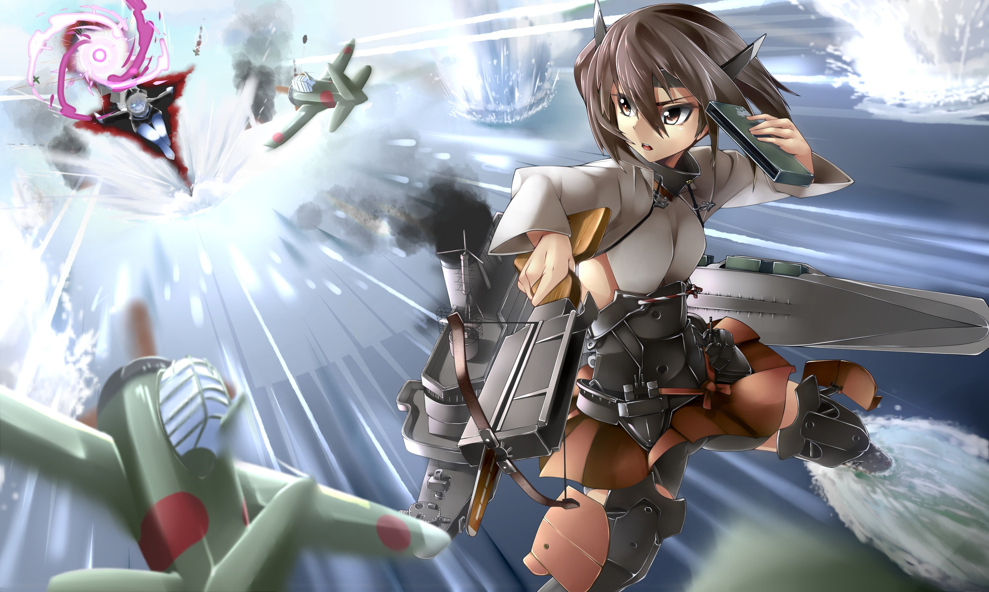 Description: A woman in a white shirt and a green plane flying over a city with fighter jets in the background.