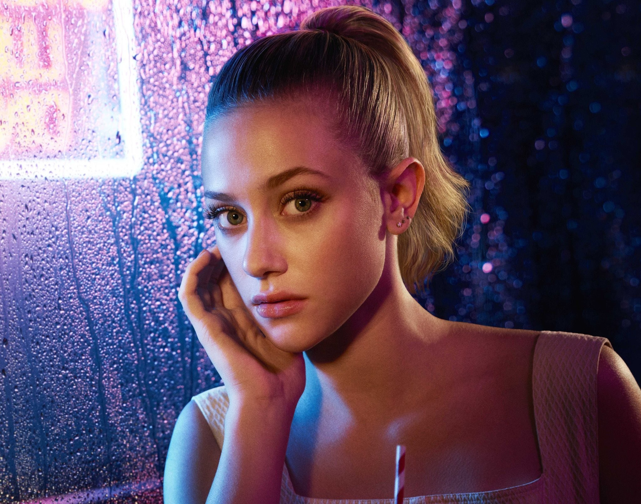 Description: A woman in a white top is standing in front of a window with rain drops on it and a phone to her ear.
