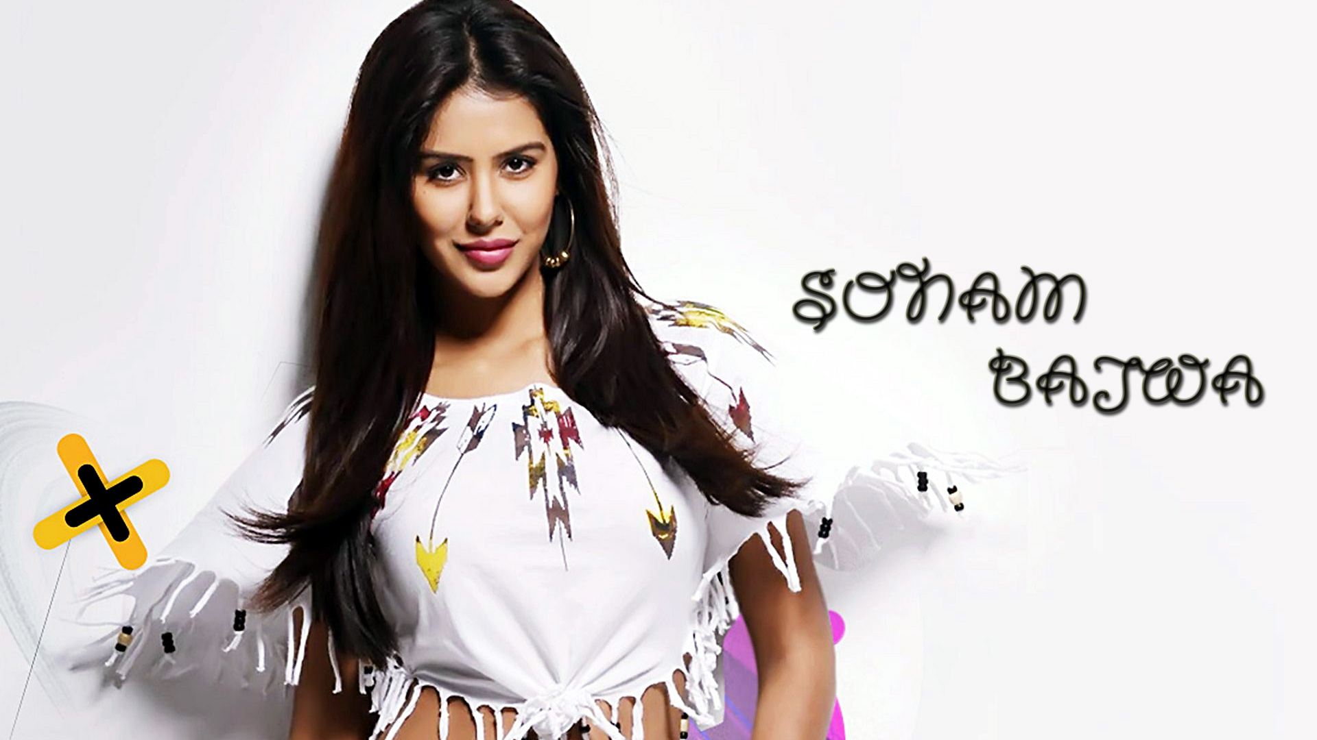 Description: A woman in a white top and a yellow and black sign with words on it and a white background.