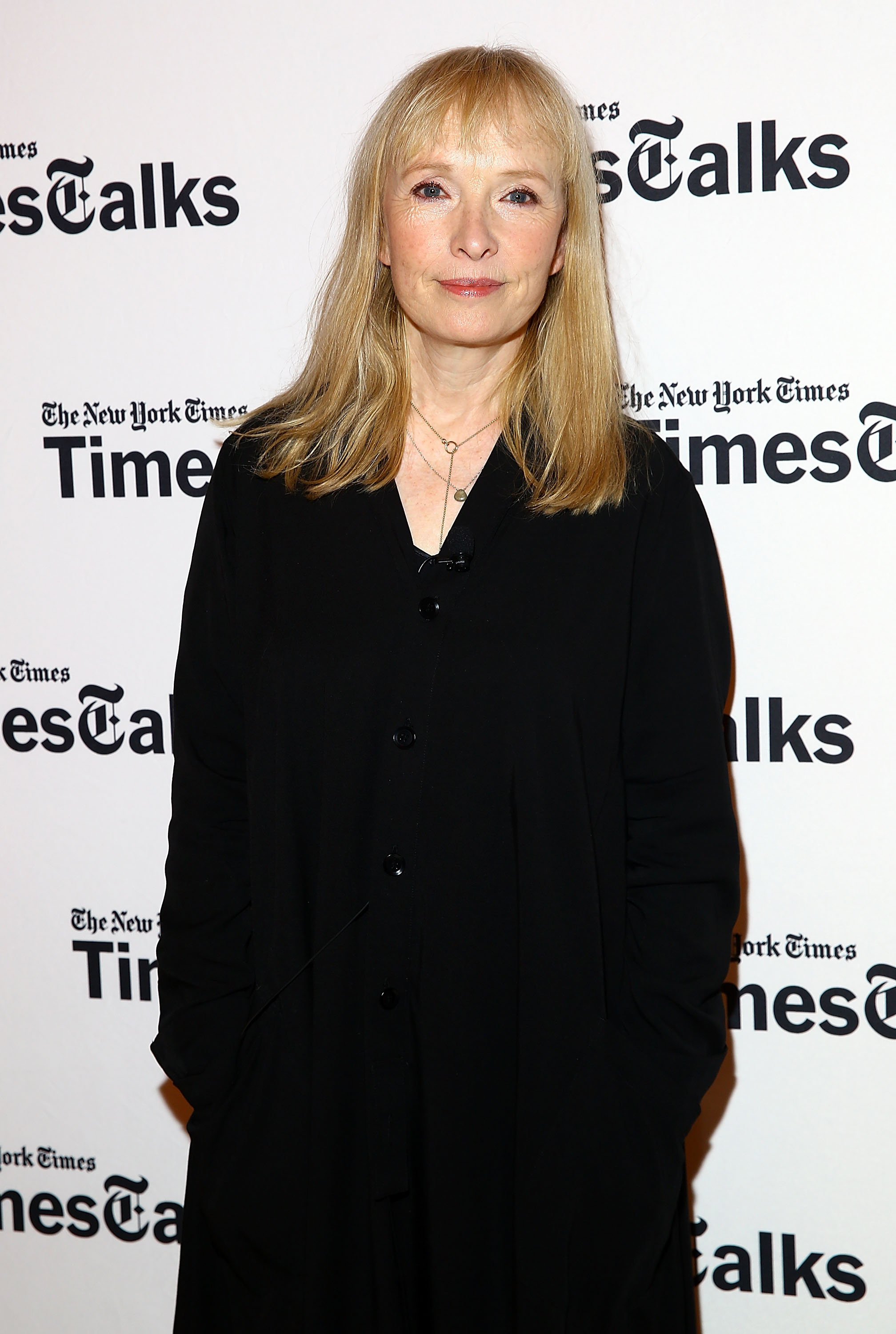 Description: A woman standing in front of a white wall with a black shirt on it's chest and a black dress on her.