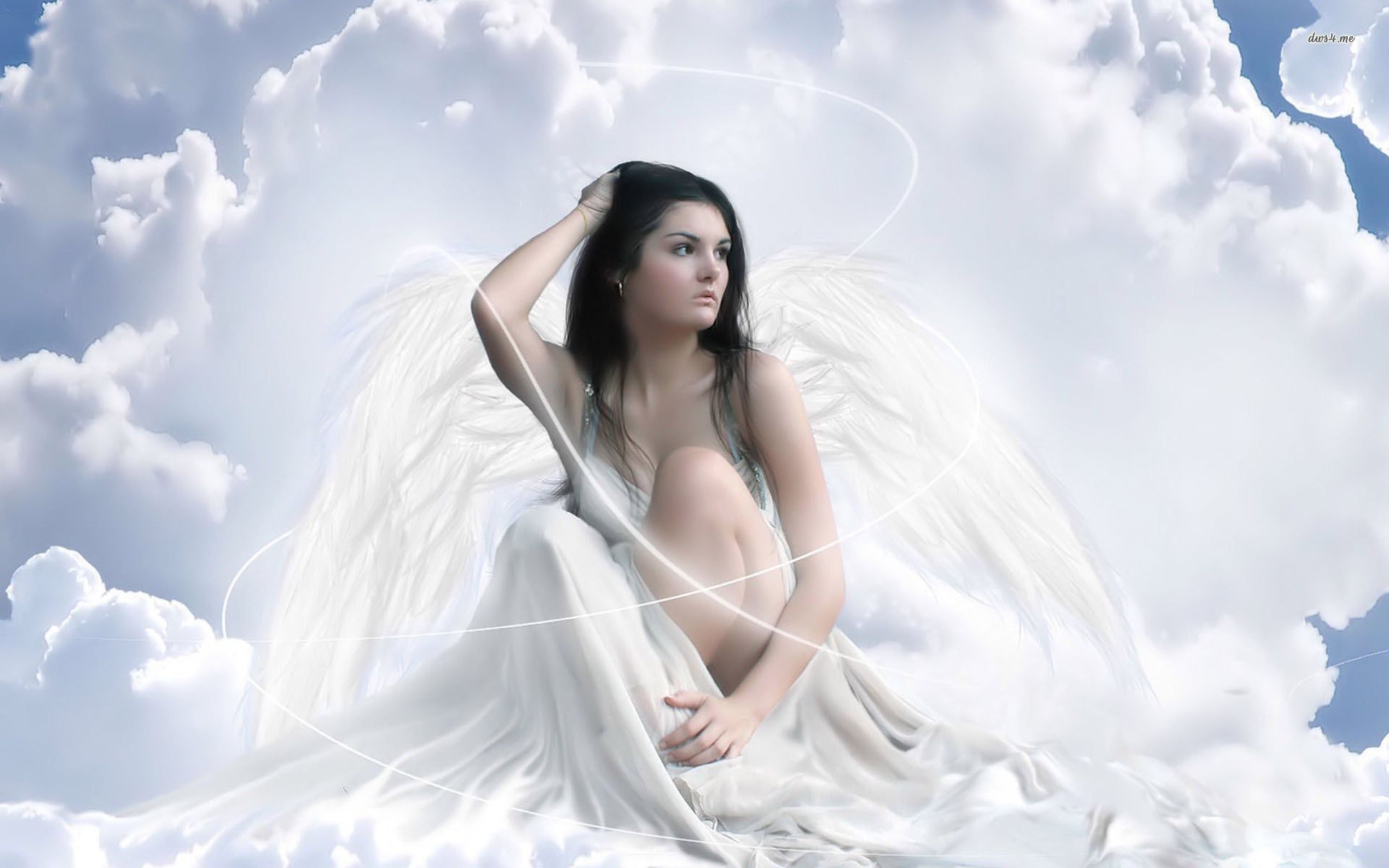 Description: A woman with white wings sitting on a cloud covered ground with a sky background and clouds in the background.