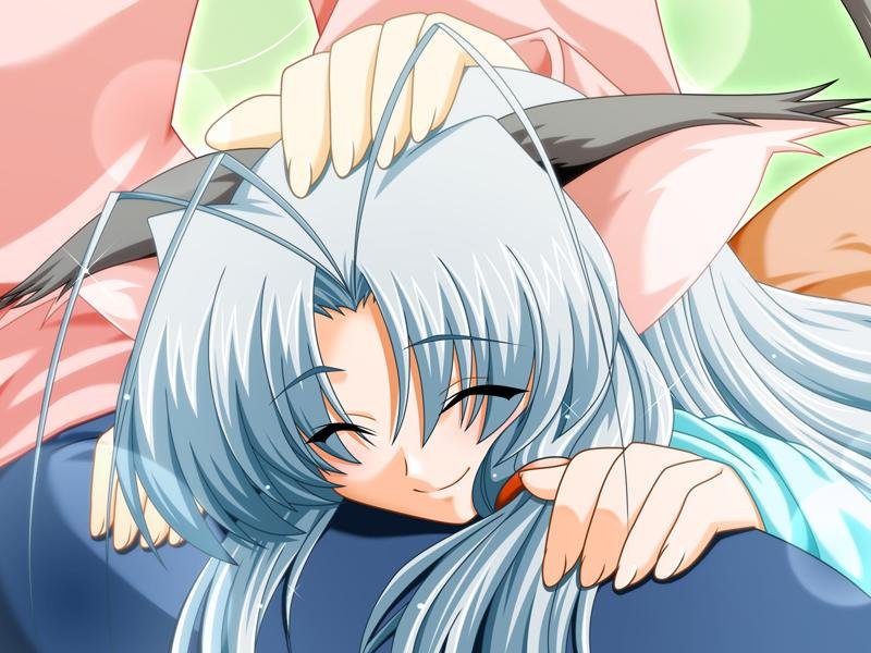 Description: A woman with long white hair and a blue shirt is holding her head in her hands and looking at the camera.