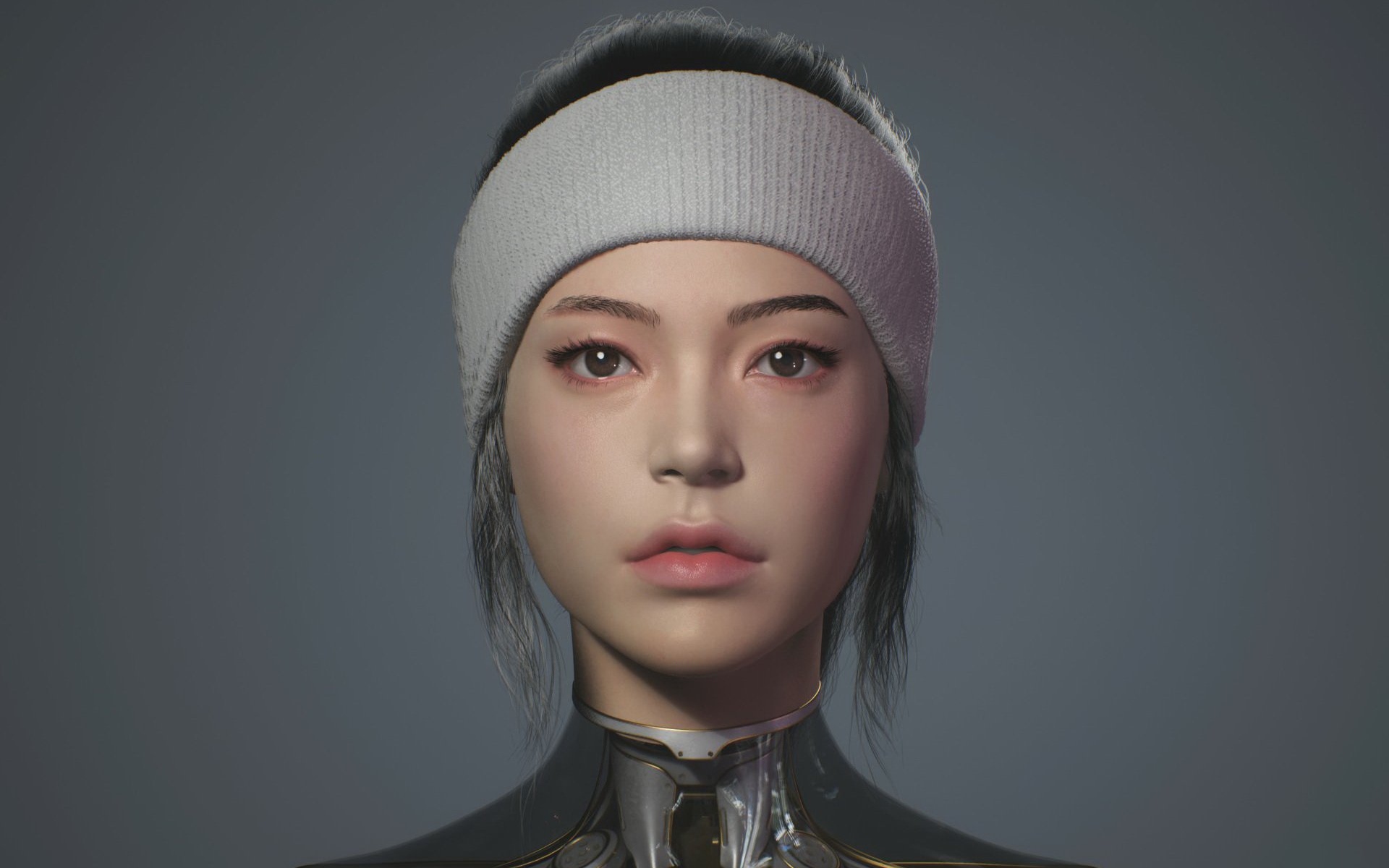 Description: A woman with a white headband and a white hat on her head and a gray background with a gray background.