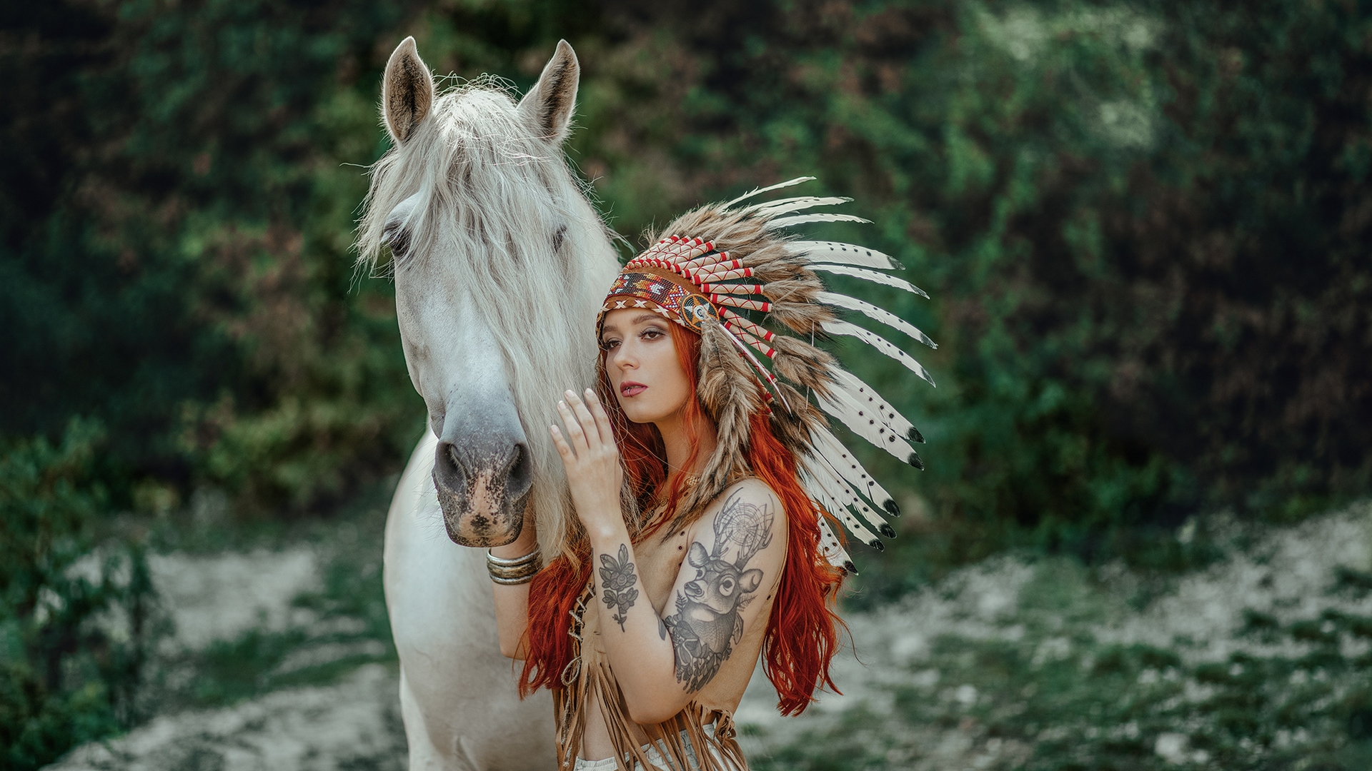 Description: A woman with a white horse in a field of grass and trees in the background.