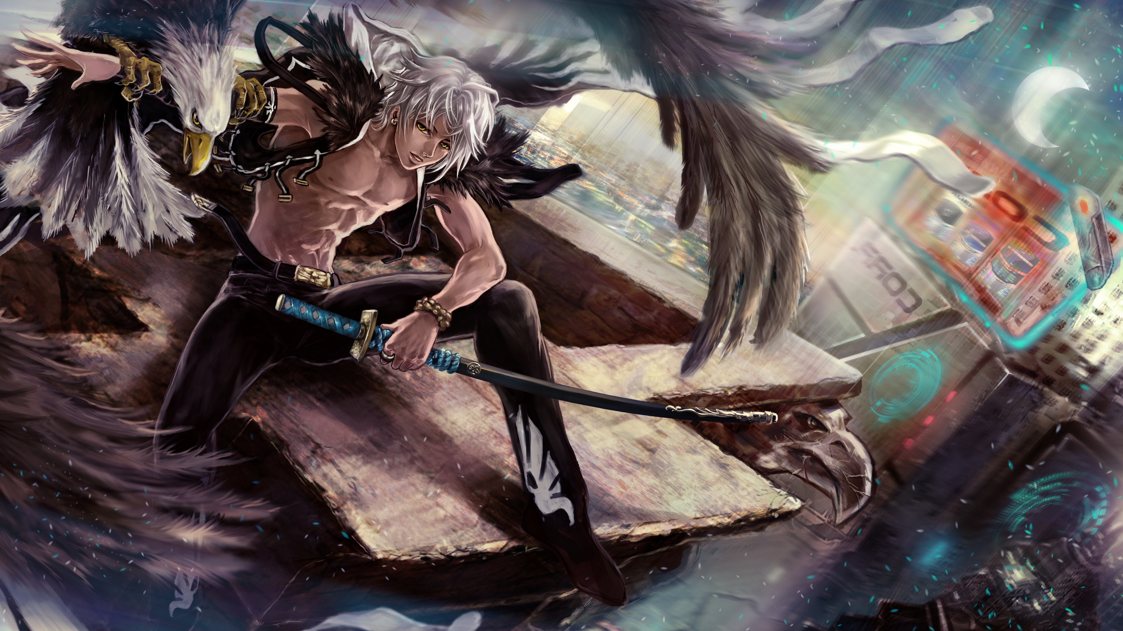 Description: A woman with wings on top of a wooden structure with a sword in her hand and a city in the background.