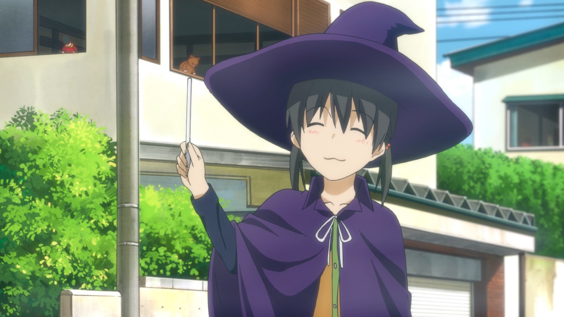 Description: A woman in a witches costume holding a broom in front of a building with a tree in the background.