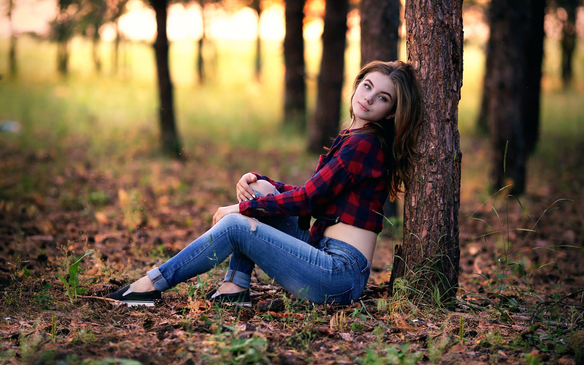 Description: A woman sitting in the woods next to a tree looking up at the sky with her eyes closed and her hands on her hips.