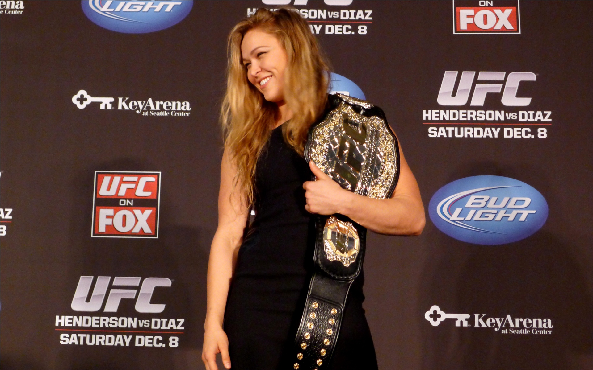 Description: A woman holding a wrestling belt and smiling at the camera with a black background and a red carpet behind her.