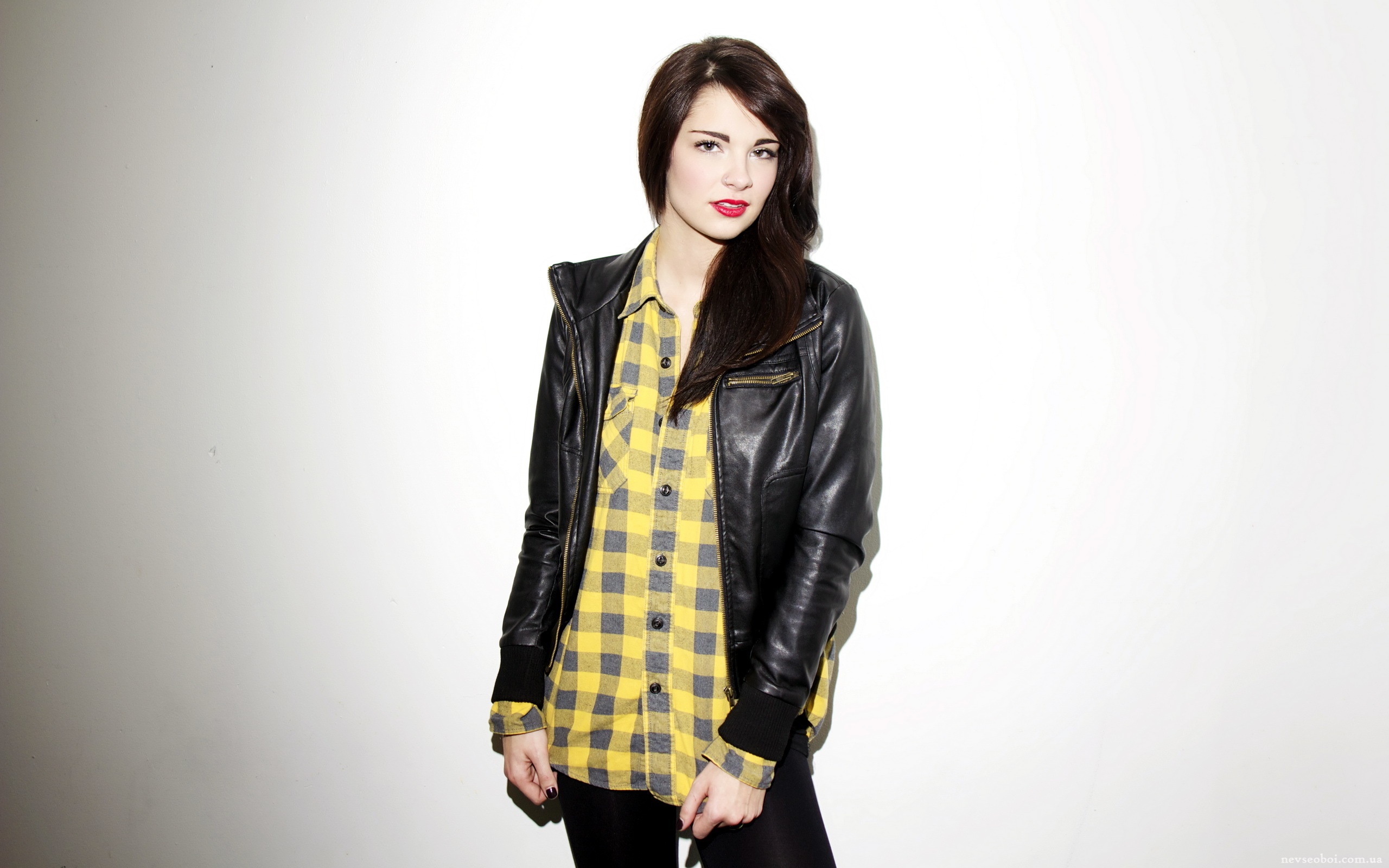 Description: A woman in a yellow and black shirt and black jacket and black pants and a black leather jacket and a white background.