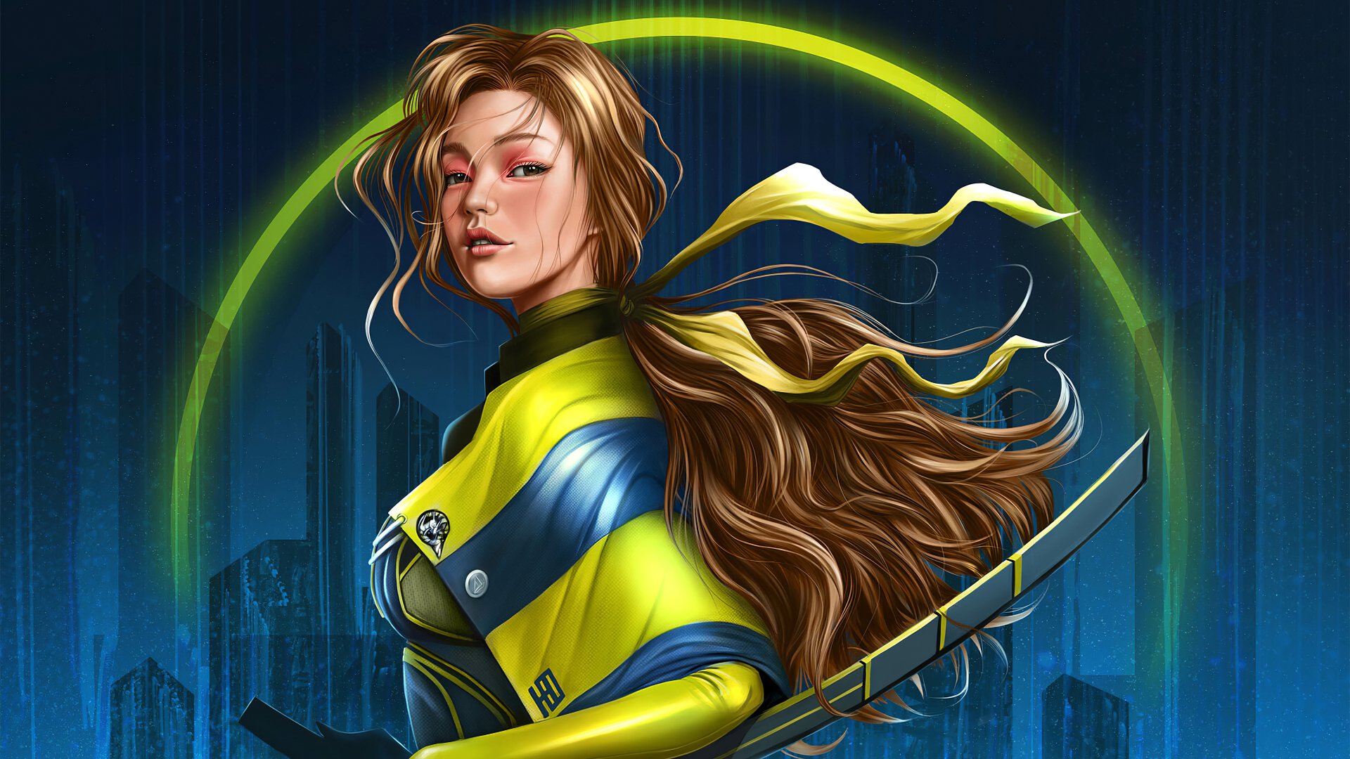 Description: A woman in a yellow and blue suit with a yellow and blue background and a green circle around her.