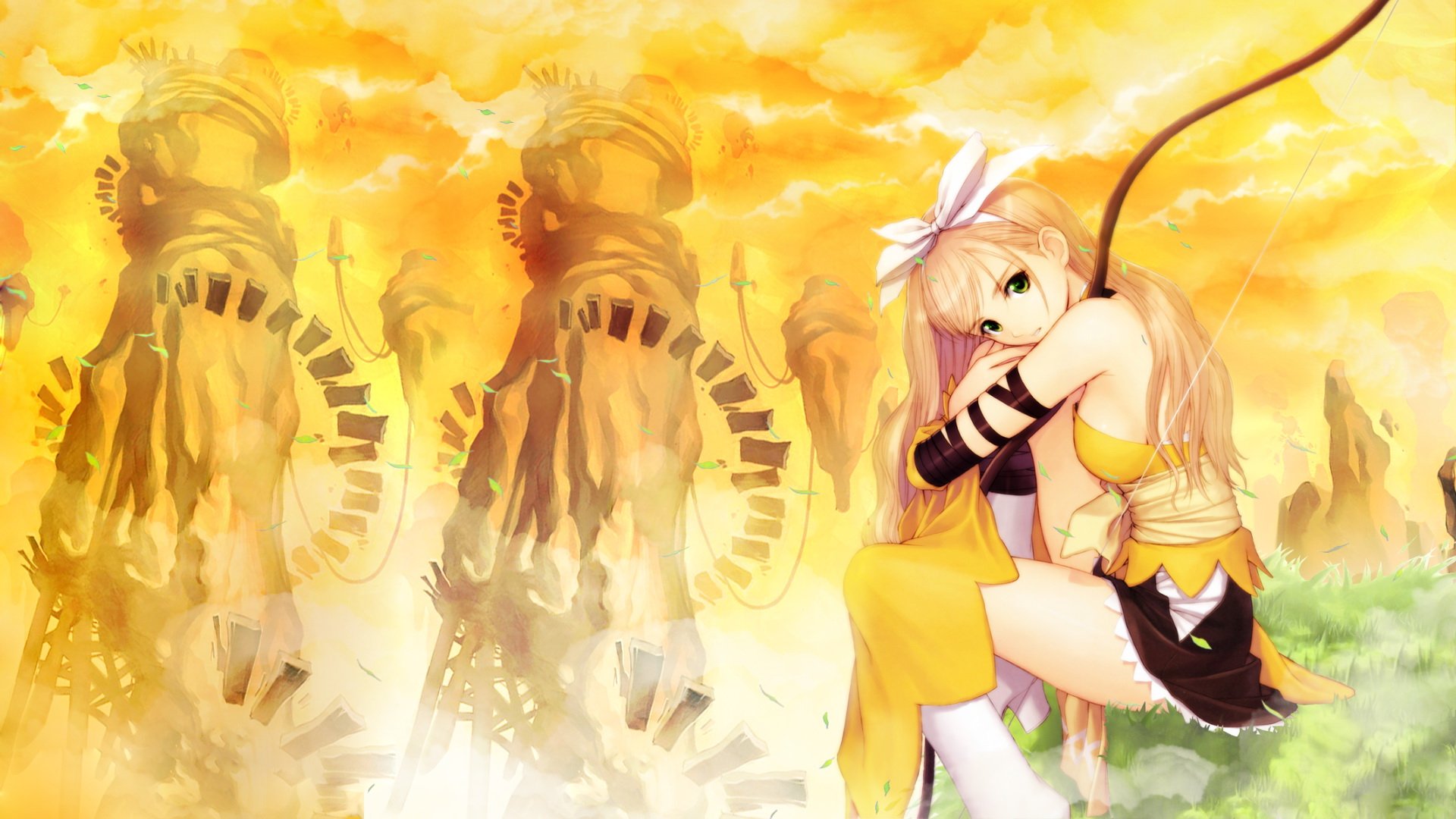 Description: A woman in a yellow dress holding a bow in front of a group of people in a field of grass.