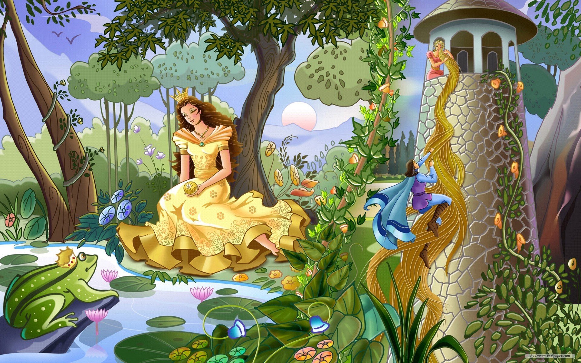 Description: A painting of a woman in a yellow dress sitting on a rock in a forest with a pond and a frog.