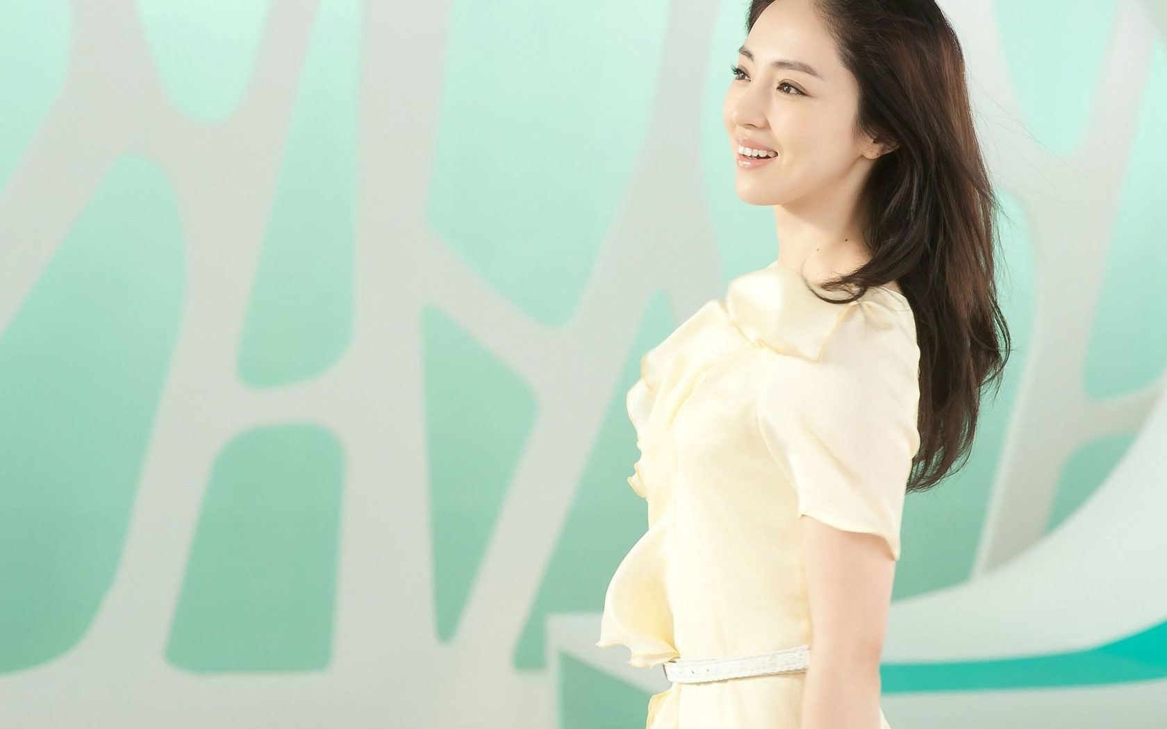 Description: A woman in a yellow dress smiles at the camera while standing in front of a wall with a tree design.
