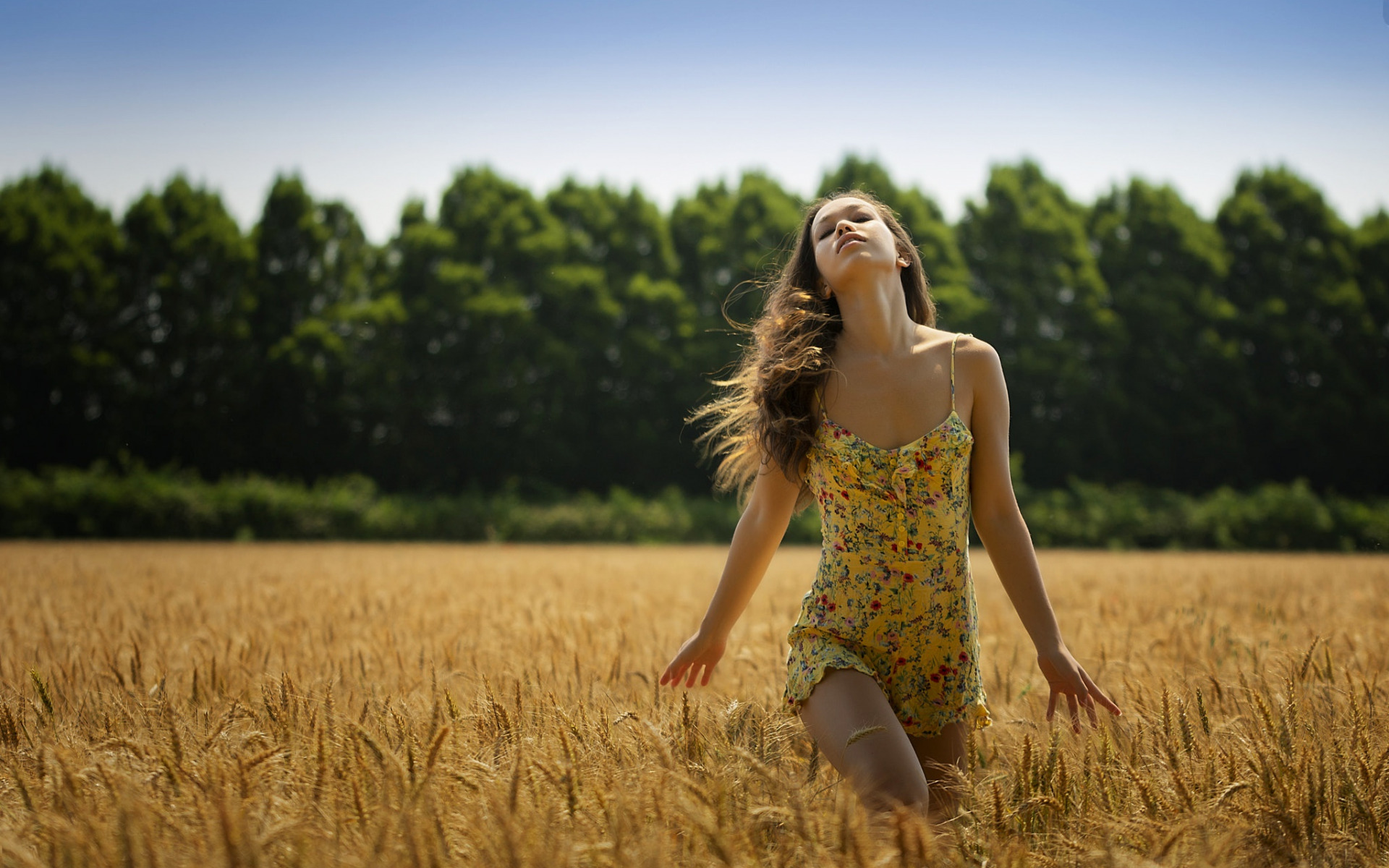 Description: A woman in a yellow dress standing in a field of wheat looking up at the sky with her eyes closed.