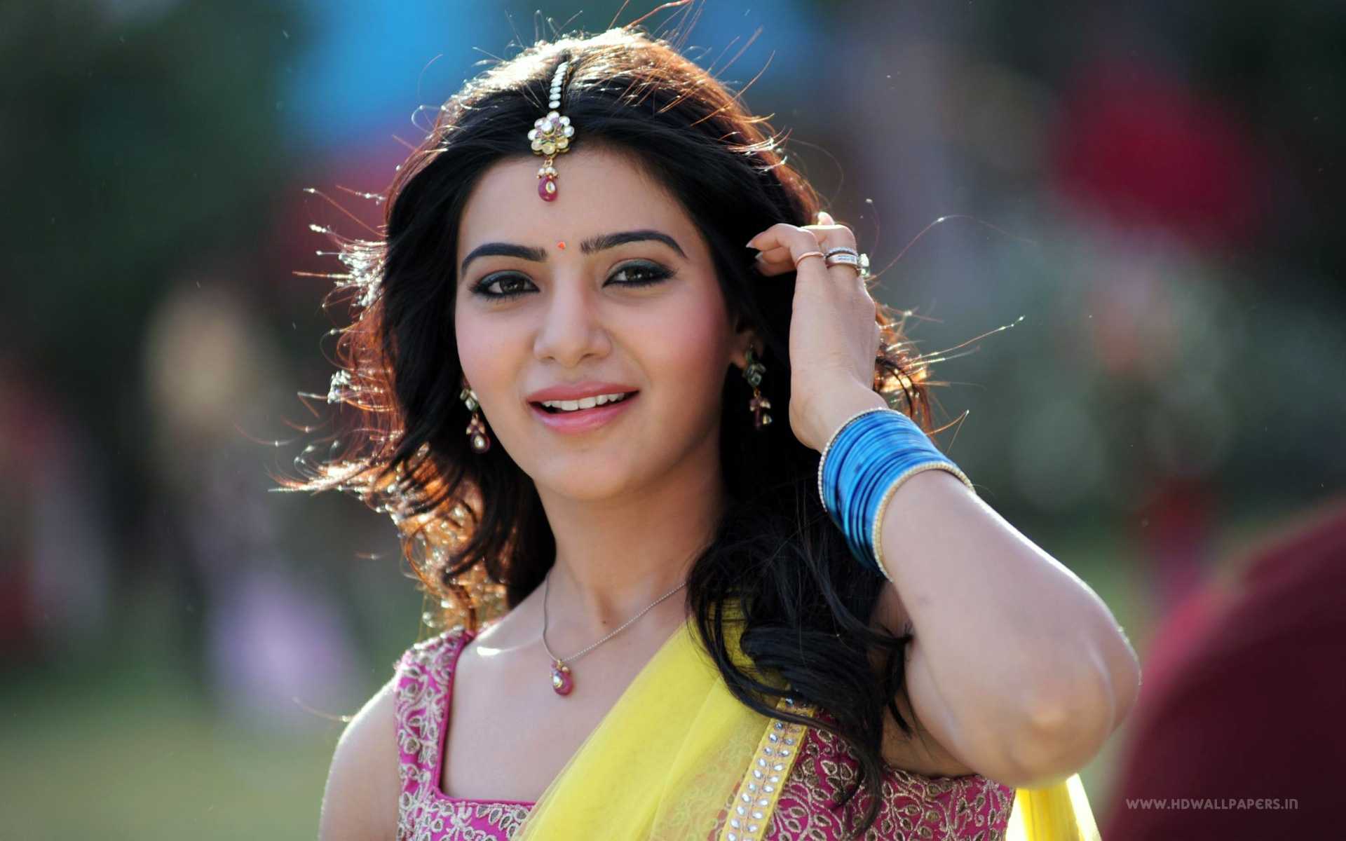 Description: A woman in a yellow sari and a yellow shawl is smiling at the camera and posing for a picture.