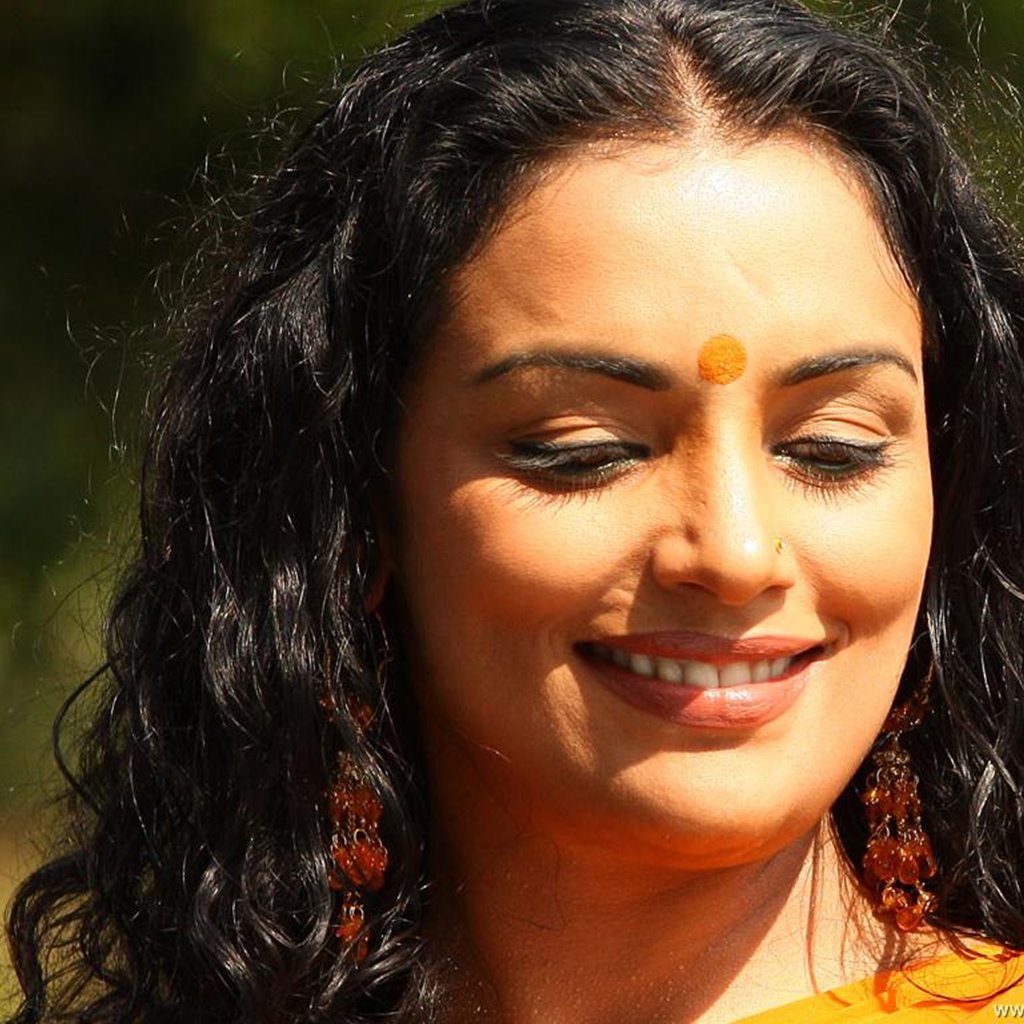 Description: A woman with a yellow shirt and a yellow necklace and earrings on her head and a smile on her face.