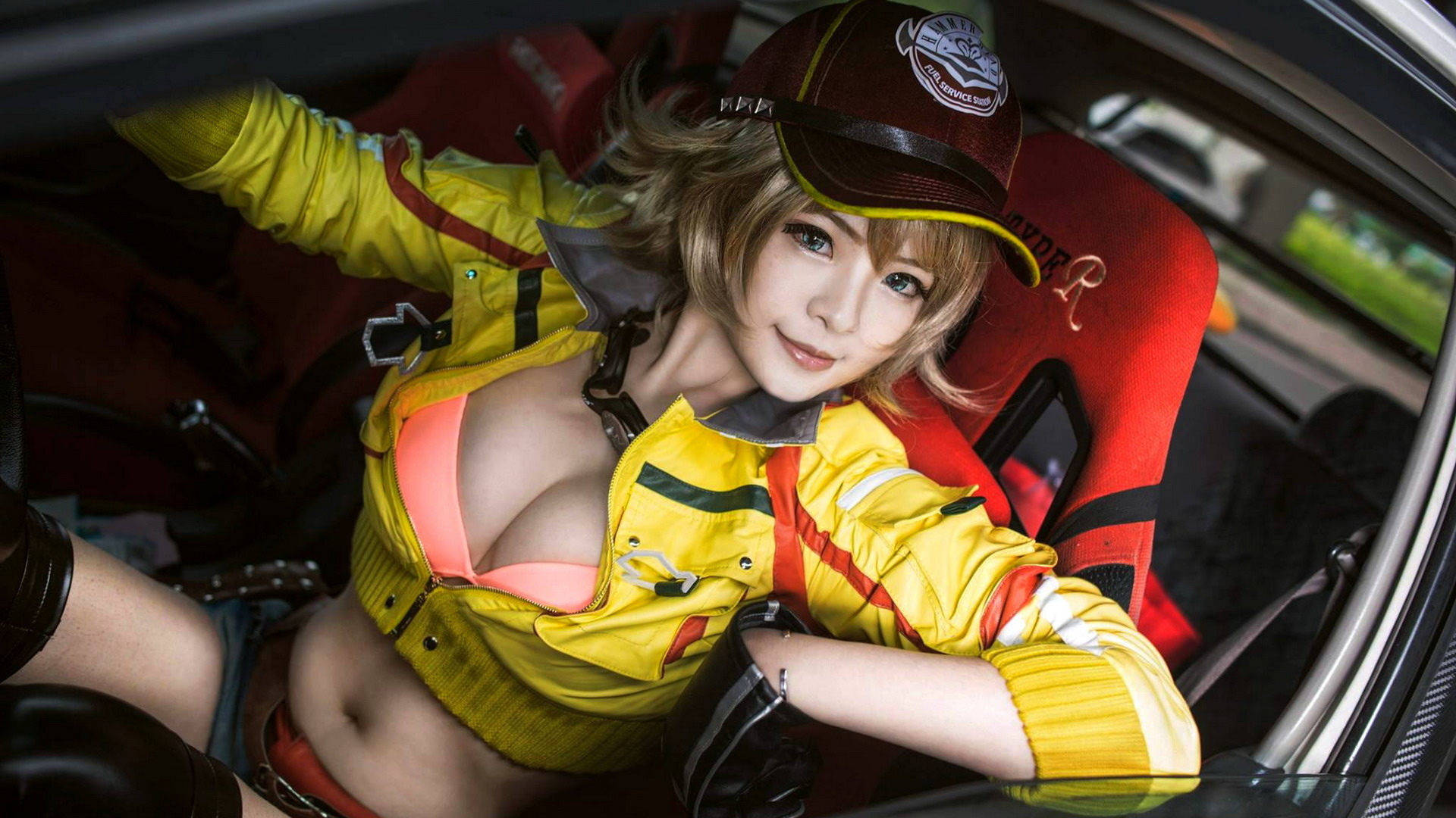 Description: A woman in a yellow uniform sitting in a car seat with her arm on the back of a car.