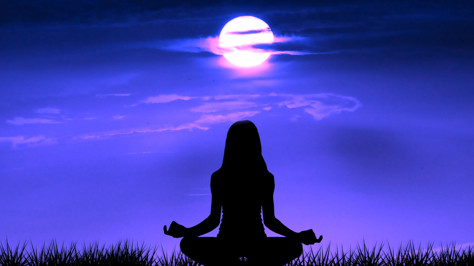 Description: A woman is sitting in a yoga position in front of a full moon and a purple sky with clouds.
