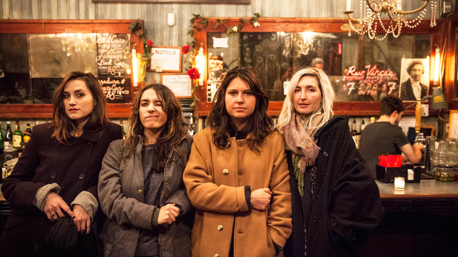 Description: A group of women standing next to each other in a bar with a man in the background and a woman in the foreground.