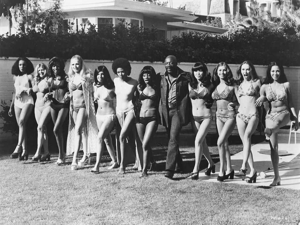 Description: A group of women in bathing suits standing next to each other in front of a wall and a house.