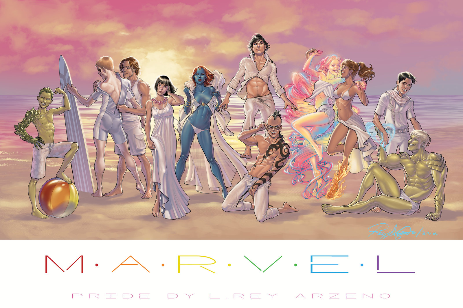 Description: A group of women standing on top of a beach next to a sunset and a sky background with the word marvel.