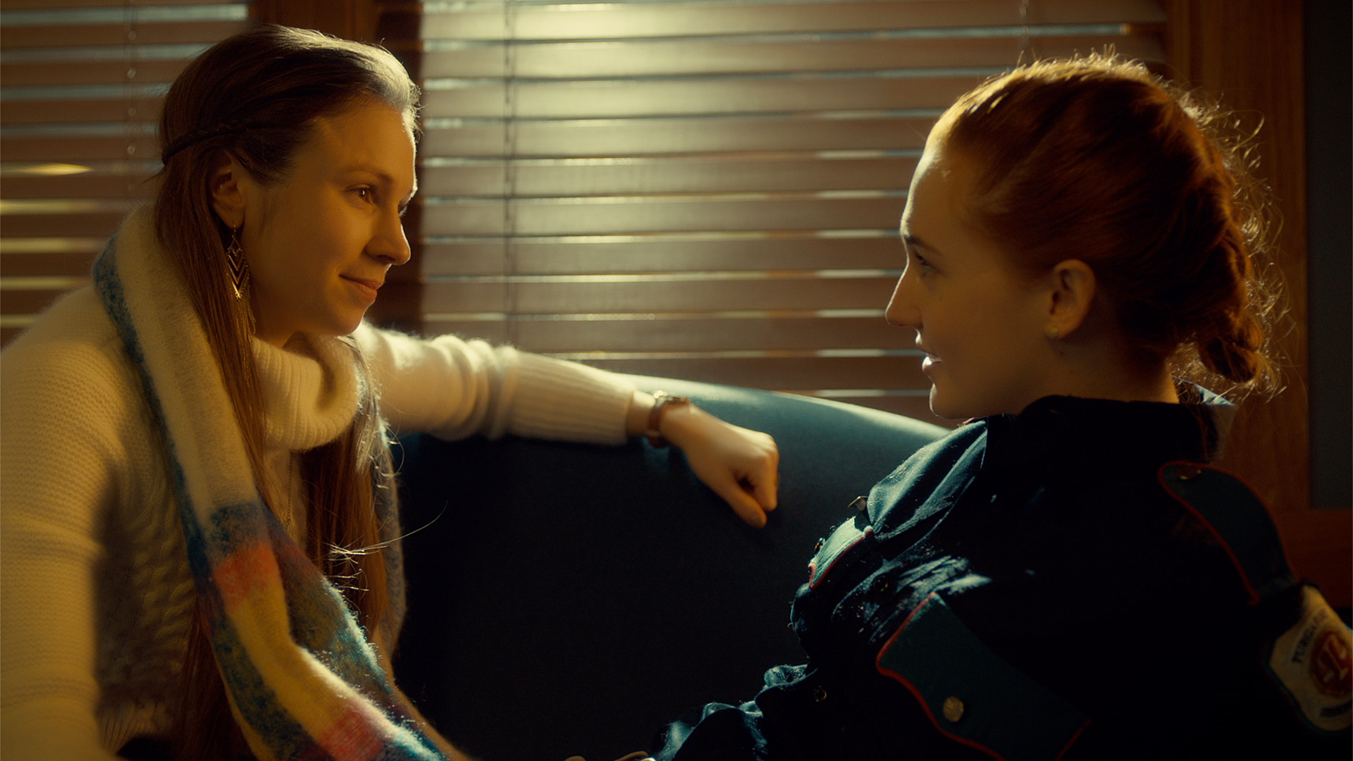 Description: Two women sitting on a couch talking to each other in a room with blinds on the windows and blinds in the windows.