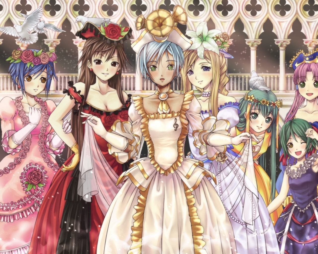 Description: A group of women in dresses standing next to each other in front of a fence and a building with a clock.
